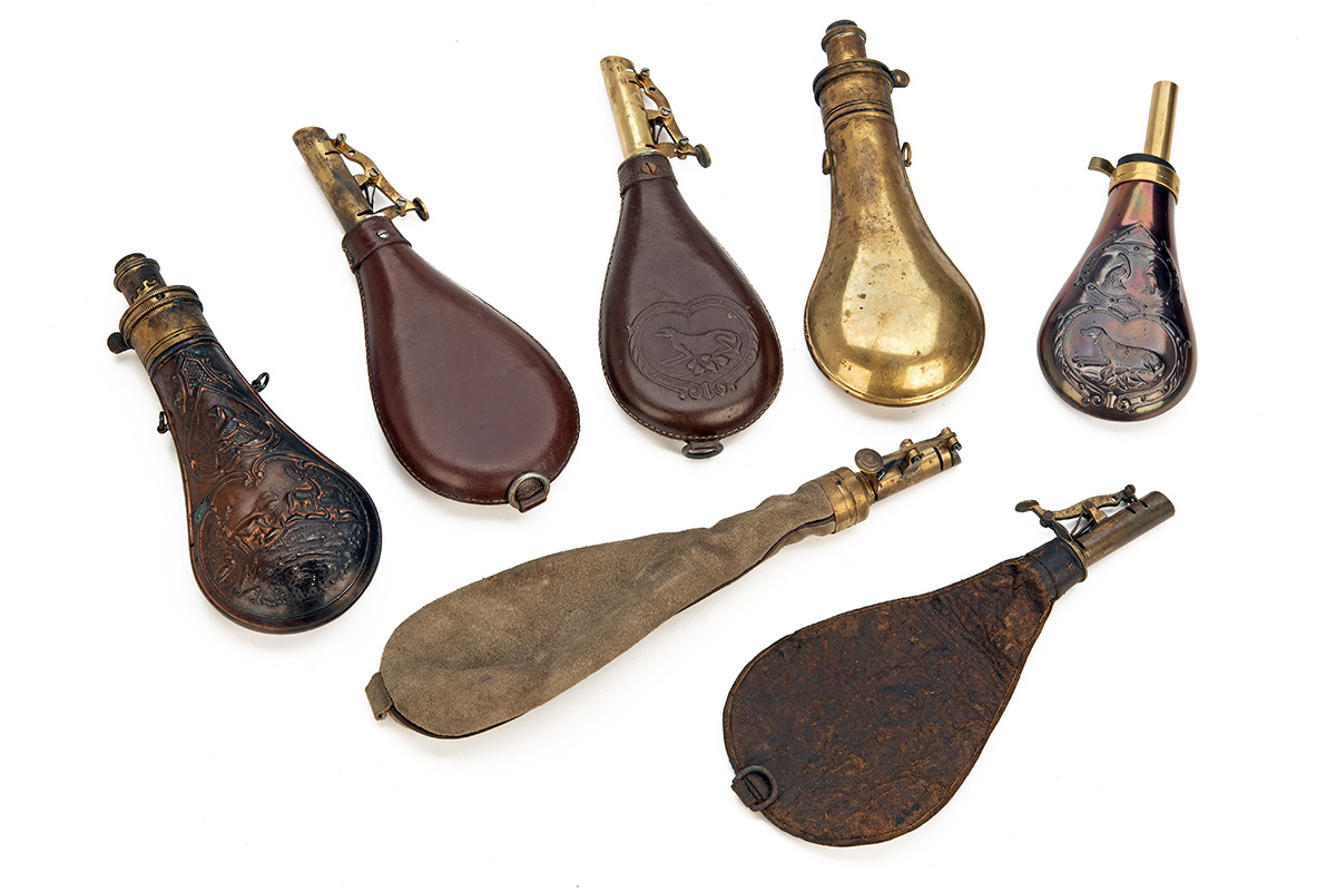 SEVEN REPRODUCTION POWDER & SHOT FLASKS, assorted leather, brass, copper reproduction powder & shot flasks,