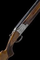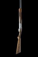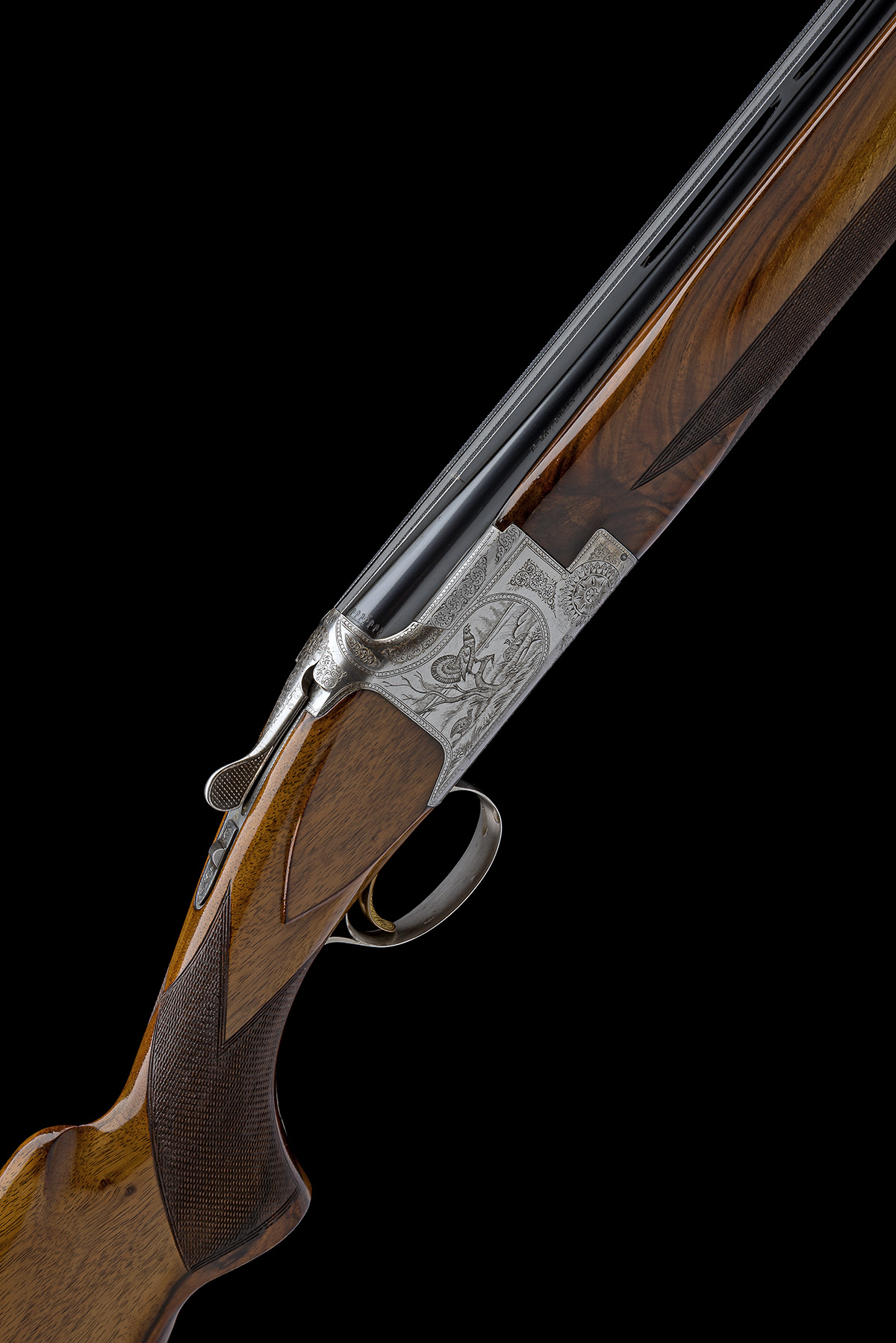 for 1975, 27 1/2in. nitro barrels with 12mm ventilated matt top-rib, 2 3/4in. chambers, bored approx. imp. cyl. and 1/4 choke, hold-open toplever, manual safety with integral barrel selector switch with gold-inlaid 'O', 'U' and 'S' details, chequered gold-washed single trigger, beaded border and partial acanthus scroll engraving surrounding vignettes of pheasant and capercaillie, 14 1/4in. figured pistolgrip stock including trademark buttplate, weight 7lb. 6oz.