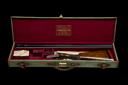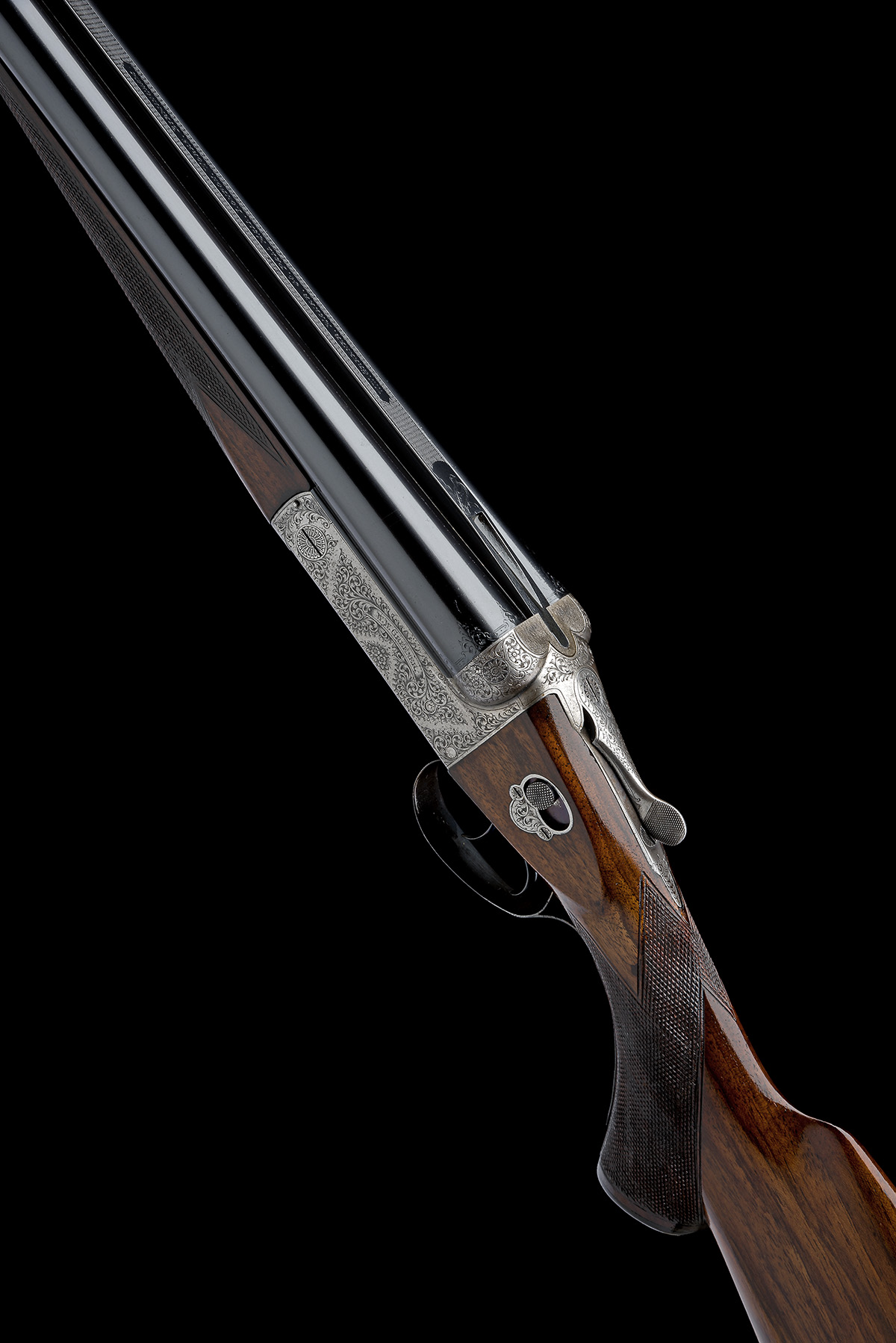 for 1951, 30in. Greener trade mark nitro barrels, broad raised matt rib with banner engraved 'W. W. GREENER, MAKER. 40. PALL MALL. LONDON. WORKS. BIRMINGHAM', fluted at the breech end and engraved with a Blue Rock pigeon, the breech ends of the barrels engraved with bands and acanthus ornamentation, 2 3/4in. chambers, bored approx. 1/2 and 3/4 choke, treble-grip action with flat matt top standing breech, Southgate ejectors, manual side-safety with gold-inlaid 'SAFE' detail, bold floral and acanthus scroll engraving, the makers name in a scrolling banner, 15in. figured pistolgrip stock (cracked and repaired at hand) with horn pistolgrip-cap and including 1 1/4in. rubber recoil pad, fore-end with Deeley & Edge patent release catch and horn finial, weight 8lb., in its lightweight canvas and leather case with some accessories and gold-tooled red leather trade label