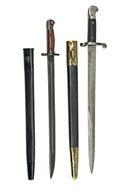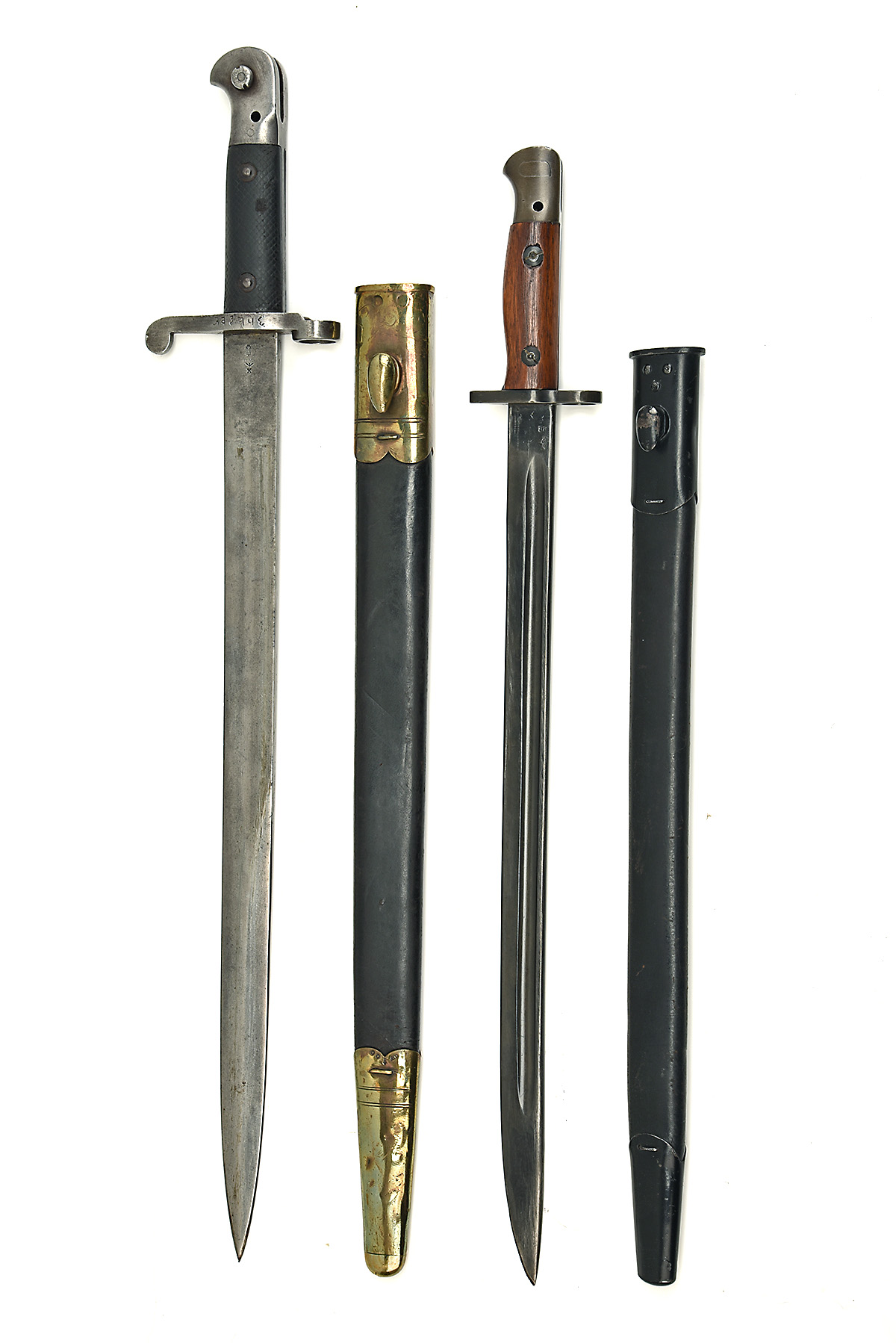 A PAIR OF SWORD BAYONETS BY WILKINSON, being 1) a Pattern 1887 Mark III sword bayonet for the Martini Henry rifle, dated 1889, 18 2/2 in. unfullered blade, forte with 'WILKINSON / SWORD COMPANY / LONDON' inspection marks and issue dates, cross-guard with Nepalese markings, pressed leather grips, pommel stamped 'N E P / 8484' together with its Indian Army brass-mounted scabbard, grips worn, scabbard fittings dented; 2) a Pattern 1907 with 17 in. single-edged blade fullered on each side, issue date 1917, ricasso with crisp markings, wooden grips, together with its black painted scabbard with steel fittings, app;ears unused since refurbishment