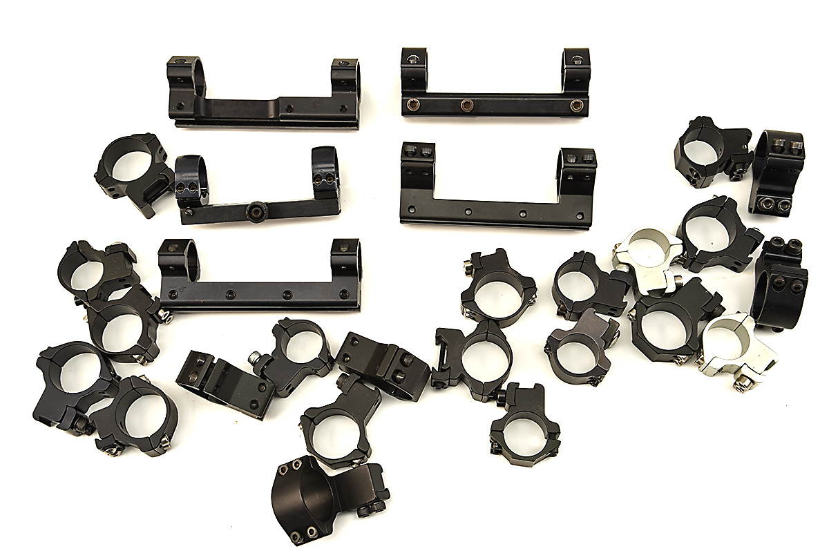 A QUANTITY OF SCOPE RINGS AND SCOPE MOUNTS, seven pairs of scope rings of various types 30mm,