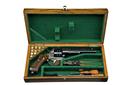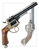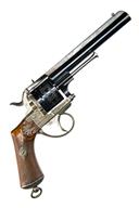 circa 1875, with round blued 6 3/16in. barrel signed on the left side of barrel throat 'E. LEFAUCHEUX. INVR. BREVETE', applied raised blued sighting rib with wishbone top-strap, dove-tailed fore-sight, standing notch rear-sight, blued six-shot cylinder with ratchet locking and open scroll engraving, scroll engraved action (traces of colour), double action mechanism, angled chequered walnut grip with lanyard ring to the engraved domed heel-plate, guarded trigger and plunge ejector, much original finish remaining and in a later oak casing lined and compartmented in green baize together with some inert reproduction rounds, a brass double cavity mould (possibly period) and a later turn-screw and cleaning rod