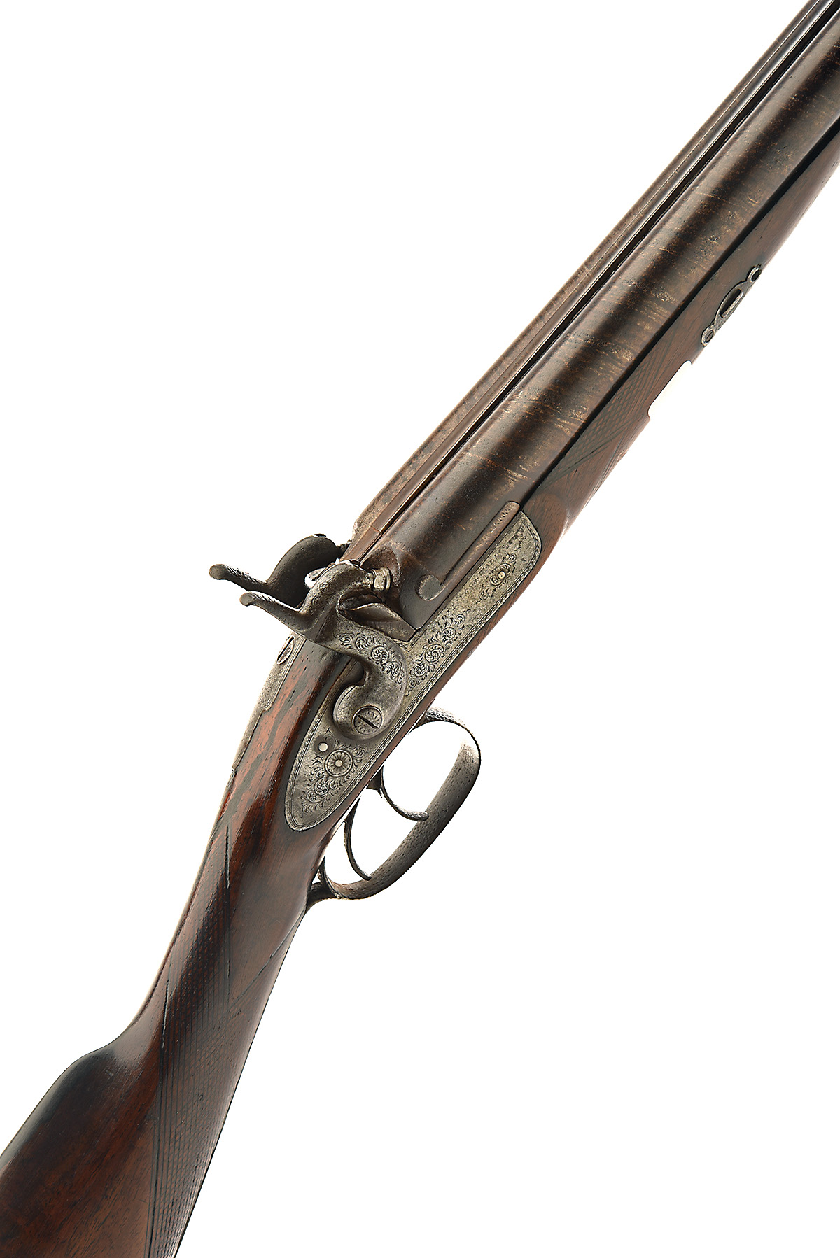 A 12-BORE PERCUSSION DOUBLE-BARRELLED SPORTING-GUN SIGNED COLLINGS & WALLIS. no visible serial number, circa 1850, with 30in. barrels crudely stamped 'HEXHAM' on the top-rib, border and scroll engraved bar-action locks signed 'COLLINGS & WALLIS'. walnut half-stock, the chequering rubbed smooth at wrist and iron furniture, with a later ramrod