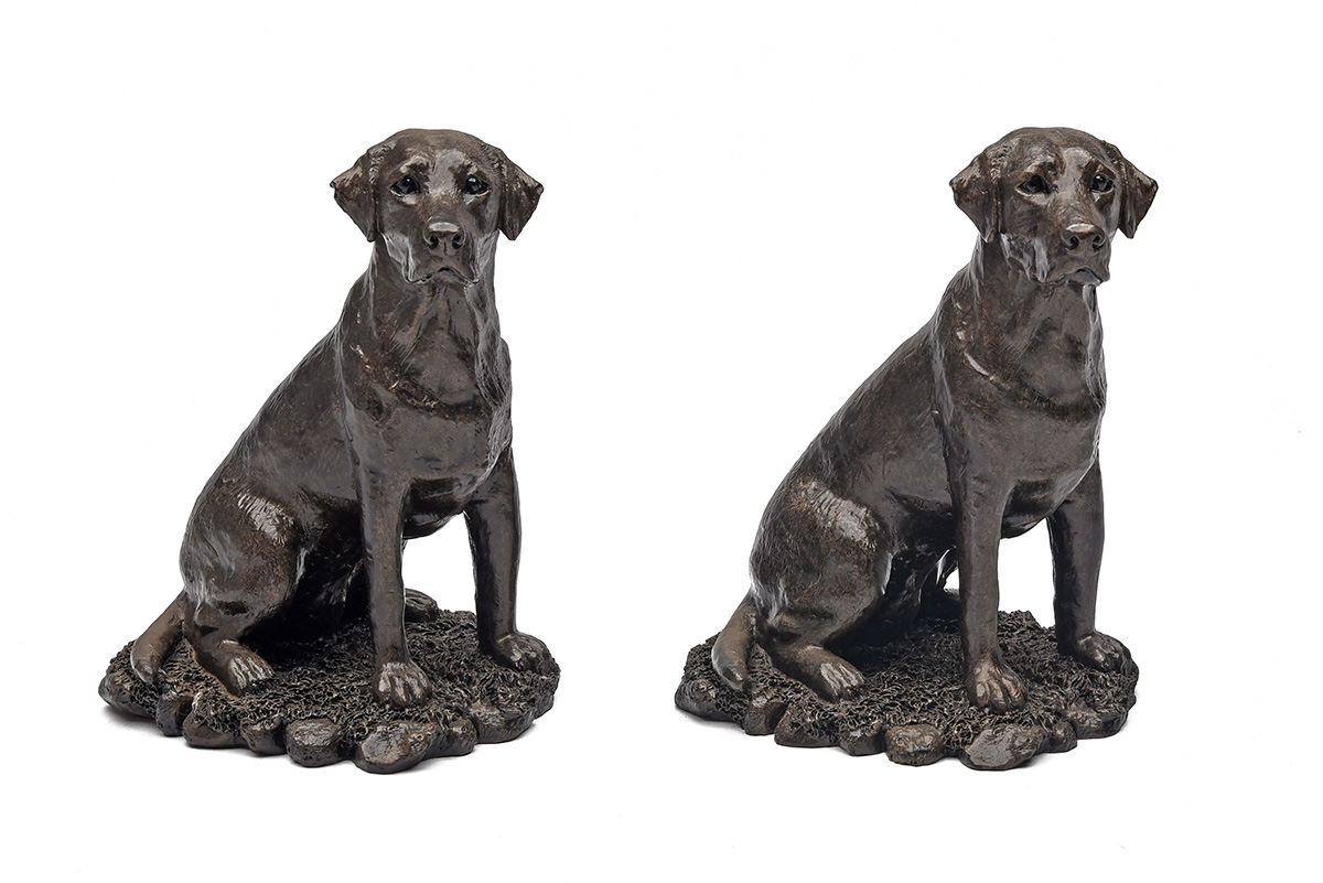 TWO UNUSED PATINA BRONZE SITTING LABRADORS, measuring approx. 6in. x 5in. x 3 1/2in. each