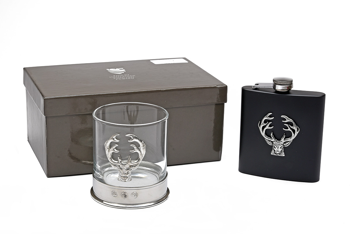 AN UNUSED BISLEY WHISKEY GLASS AND FLASK SET, with pewter and glass tumbler and flask, in their makers carton