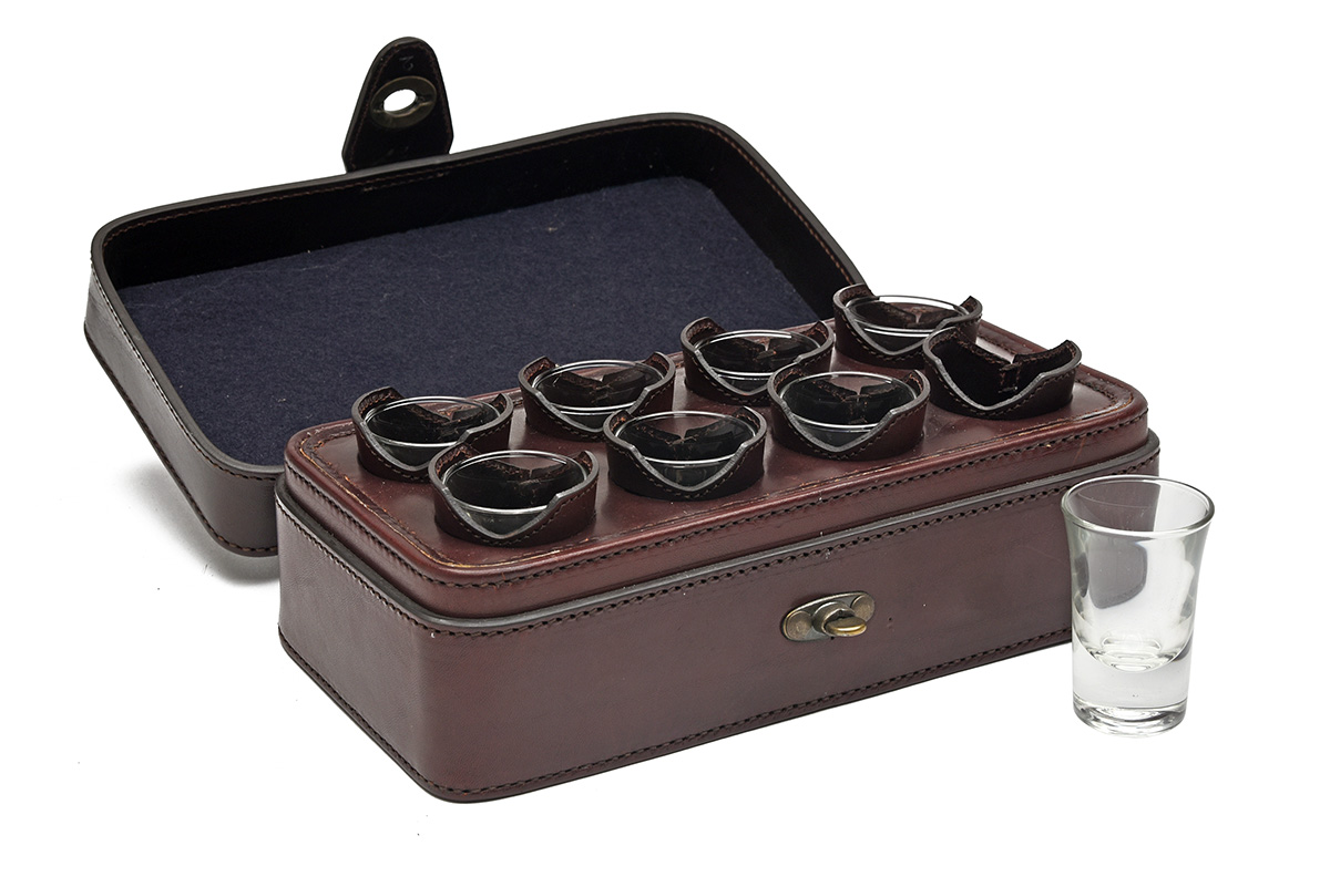 A NEW AND UNUSED LEATHER-CASED SET OF EIGHT SHOT GLASSES,