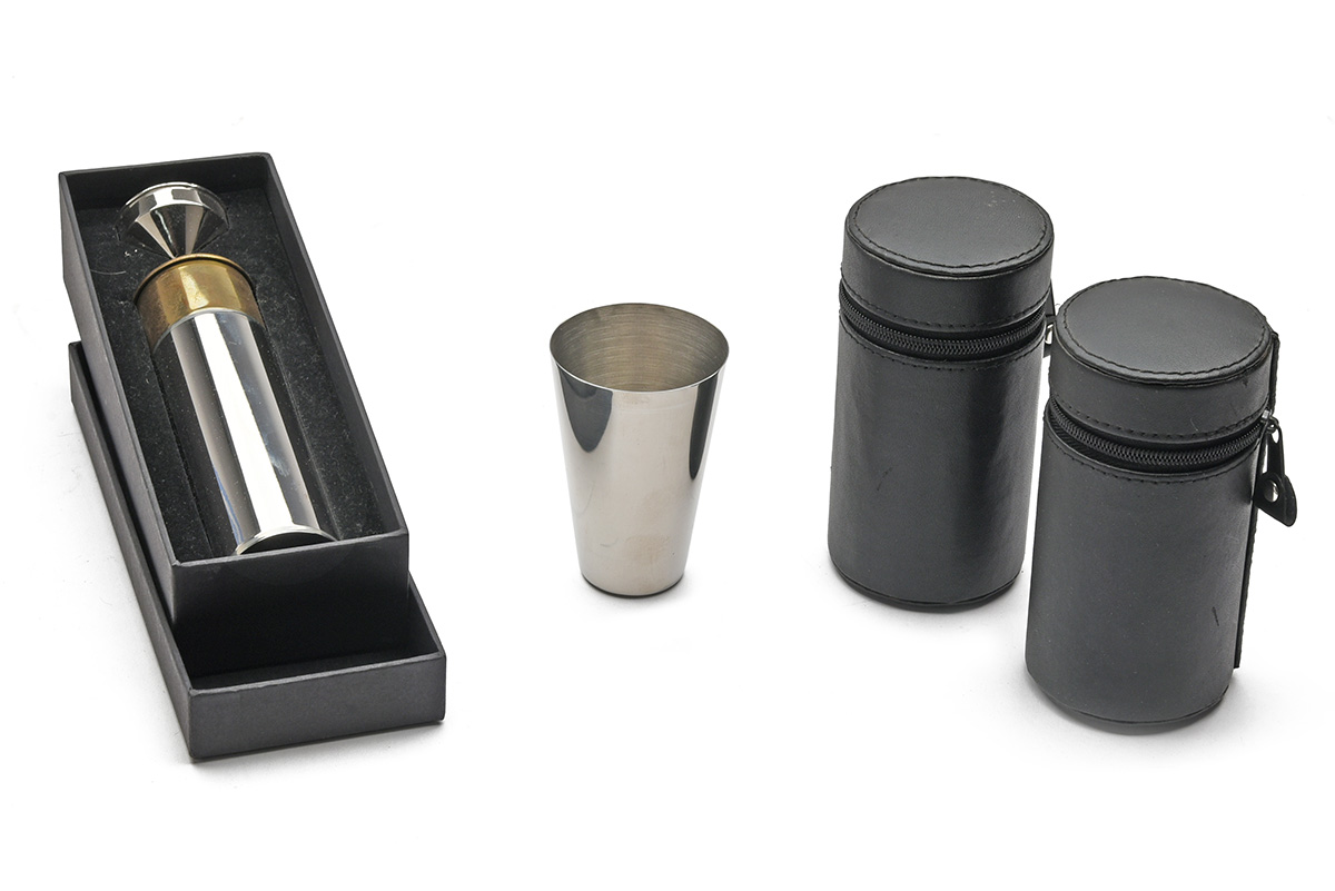 A SMALL QUANTITY OF THREE UNUSED FLASK / CUPS, comprising of a cartridge shaped drinking flask with game scene, two sets of three pewter shot drinking cups with leather cases