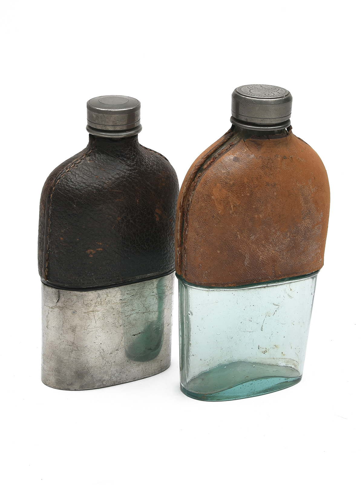 glass flask light leather (worn), corked screw cap, detachable cup missing (2)