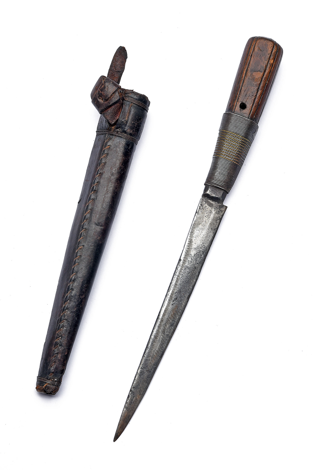 A PERSIAN KARD, mid-late 19th Century, with 6 in. single-edged decorated steel blade, wire bound wooden handle with carved decoration, together with its brown leather-covered wooden scabbard, blade reprofiled,10 in. overall length