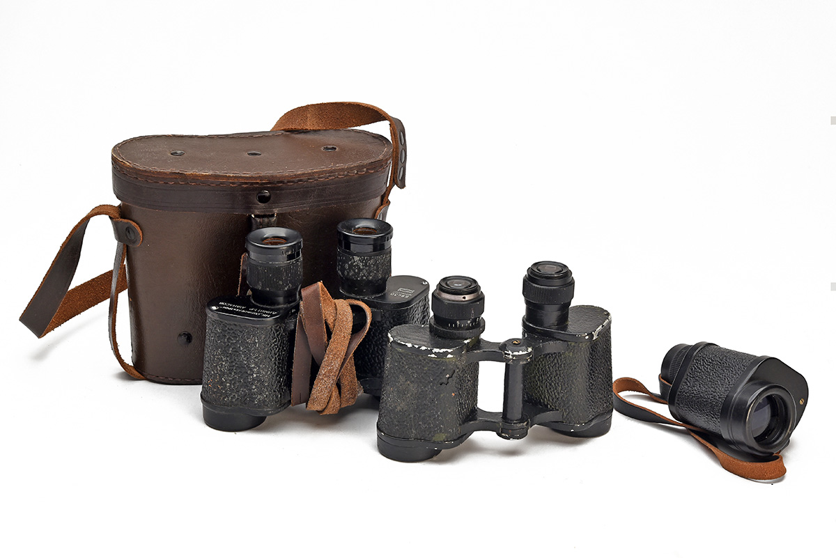 TWO 8x30 MILITARY BINOCULARS AND AN x8 MONOCULAR, being 1) circa 1980 cased Bulgarian, independent eye-piece focussing; 2) circa WWII Hensoldt Wetzlar, independent eye-piece focussing, worn, plates repainted black obscuring stamped details, missing plate screw; 3) mid-20th Century Barr & Stroud CF.27A 8x30.5 monocular (3)