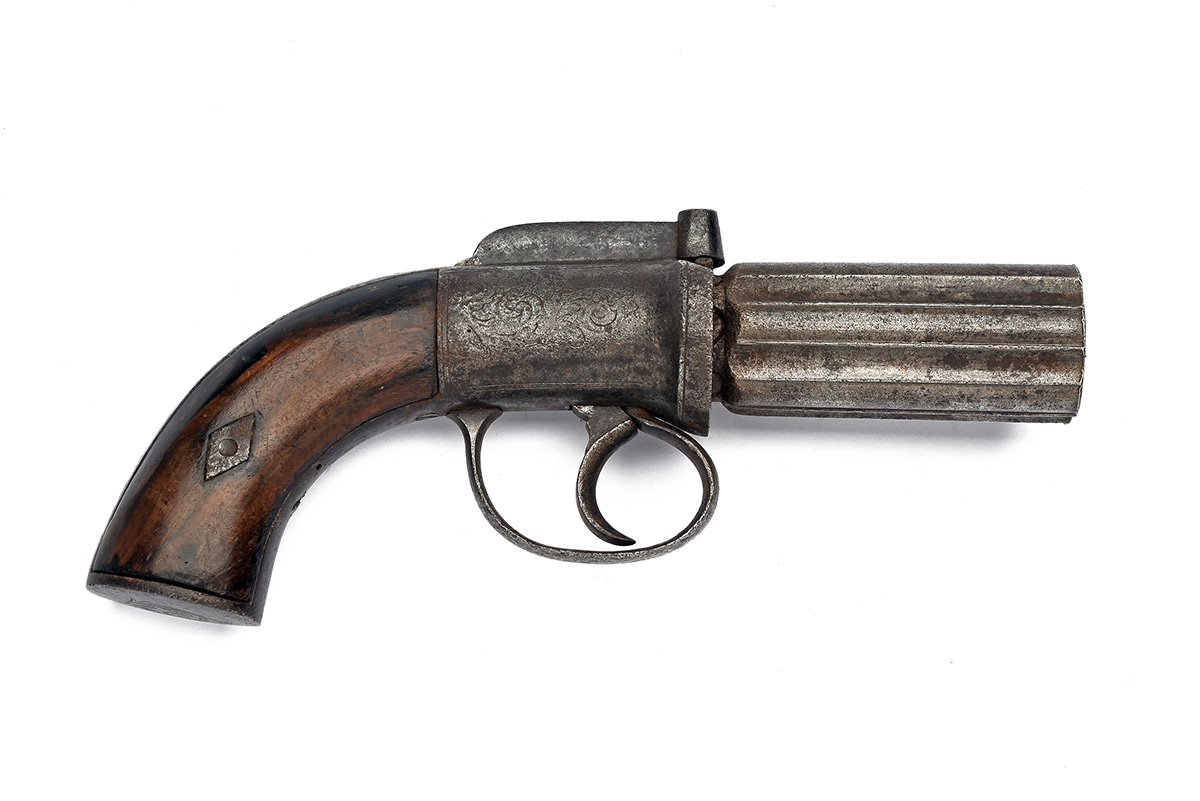 A 120-BORE SIX-SHOT PERCUSSION PEPPERBOX REVOLVER, UNSIGNED, no visible serial number,