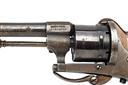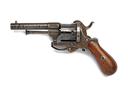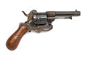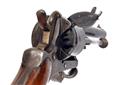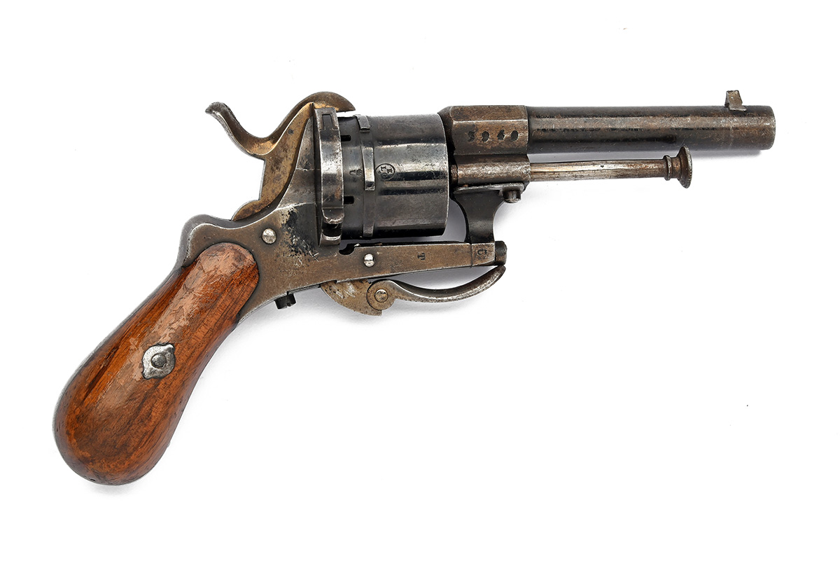A SYSTEM LEFAUCHEUX 7mm PINFIRE SIX-SHOT POCKET-REVOLVER, serial no. 3940, circa 1860, with octagonal to round 3 1/4in. blued barrel, blued cylinder with external ratchet locking, open iron frame, folding trigger and smooth walnut bag-shaped grips, strong amount of finish remaining