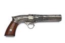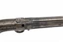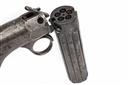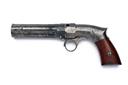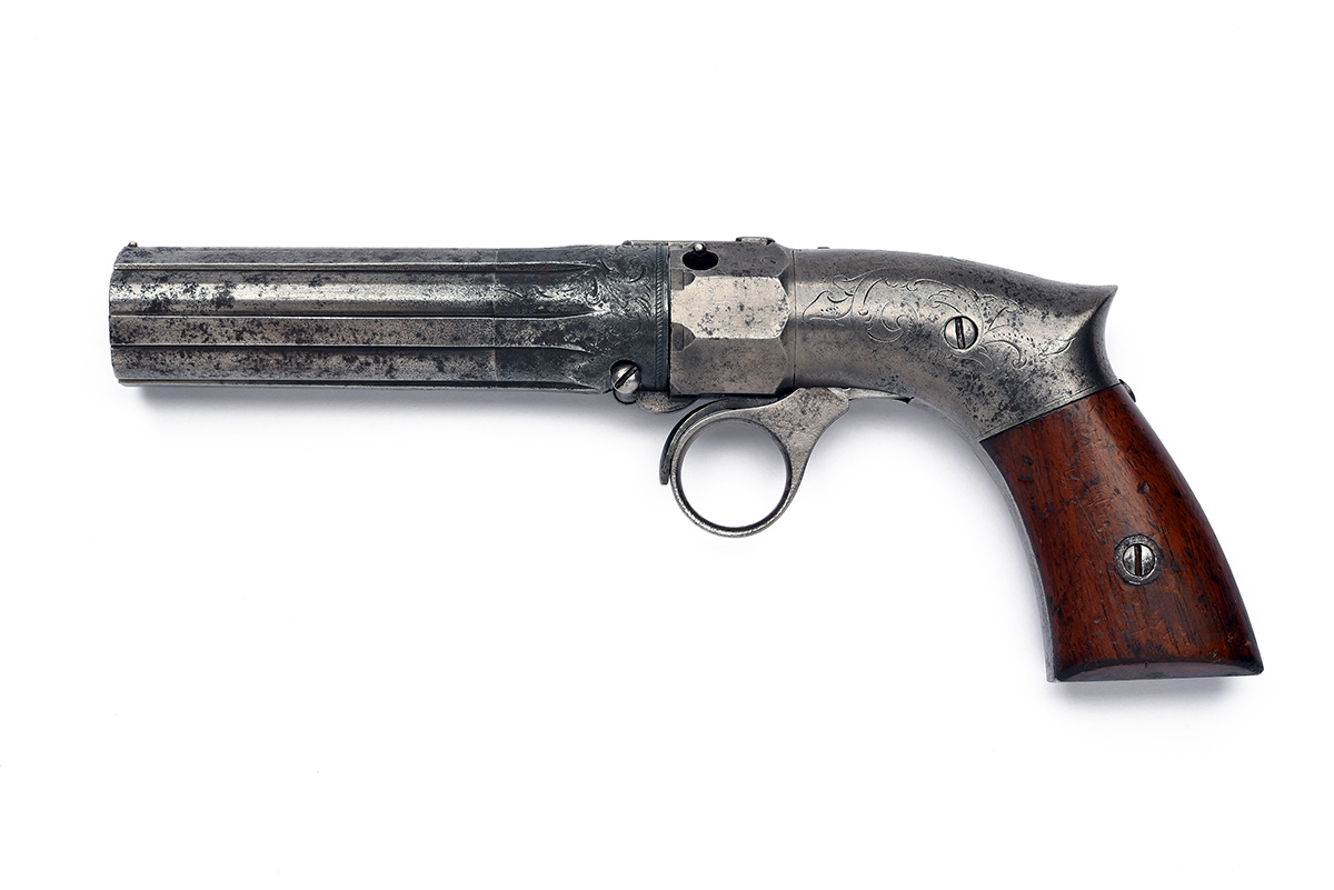 for between 1851-54, with turn-off rifled 3in. five-shot barrel group, one of the false ribs signed 'PATENT 1849', scroll engraving to the breech-end and action body, the radiused action with octagonal front section, the top with push button barrel release, the barrels hinging down for capping, single-action ring cocking trigger with additional trigger to front, saw-handled frame with rear-mounted cocking indicator and smooth hardwood grips, traces of finish