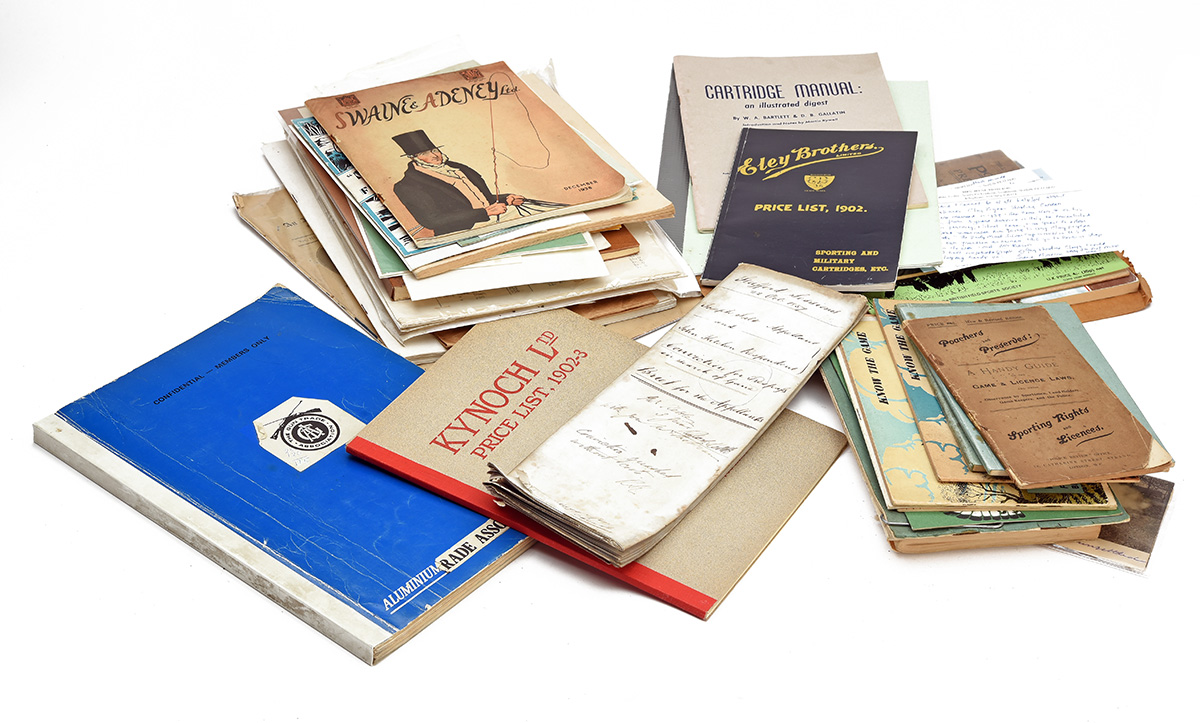 A LARGE MIXED SELECTION EPHEMERA RELATING TO SHOOTING AND COUNTRYSIDE PURSUITS, includes the Gun Trade Association 1975 Yearbook, reproduction catalogues (noted Kynoch 1902-3; Eley Brothers 1923), a 1976 Holland & Holland publication 'A Part of the Holland & Holland Collection', Poachers and Preserves Sporting Rights & Licences early 20th Century police publication, post-cards, photos, advertising flyers, information publications, booklets, letters, invoices, cigarette cards, catalogues, a 1909 Demise of Fishing Rights indenture relating to Warehan Broad, Norfolk, a 1857 Staffordshire Sessions document relating to the quashing of a poaching conviction, etc., etc., mixed conditions (qty)