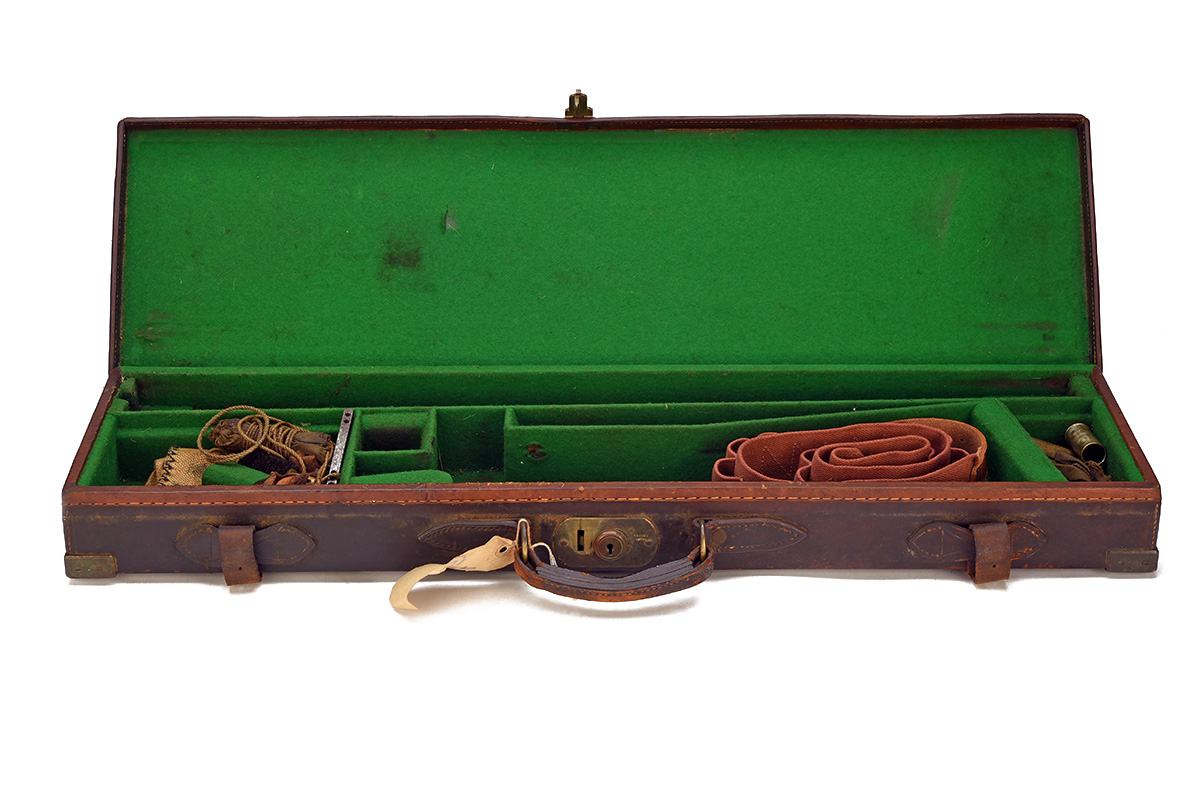 fitted for 30in. barrels, the interior re-lined with green baize, brass lock (key missing), 12-bore cartridge belt, 12-bore snap-caps