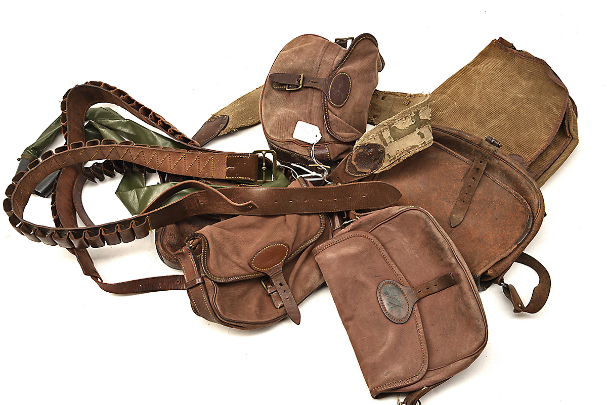 A QUANTITY OF SHOOTING RELATED ITEMS, comprising of 2 x leather cartridge belts, a vintage quick release cartridge belt, a shoulder cartridge fast loader, 4 x vintage cartridge bags