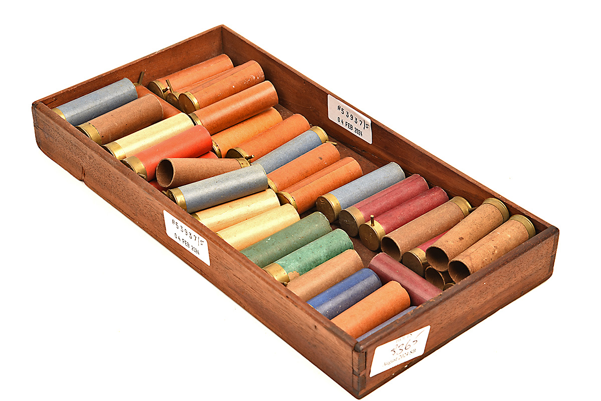 A COLLECTION OF APPROX. 50 PIN-FIRE SHOTGUN CARTRIDGES CASES, Please be advised that cartridges/ammunition, primers, primed cases, blanks and percussion caps CANNOT BE SENT ANYWHERE in the UK or EXPORTED OVERSEAS by POST or CARRIER. Due to this NATIONAL and INTERNATIONAL CARRIER rule, within 30 days of the sale date, please arrange collection with our shipping department from our Norfolk HQ. If payment and collection is not arranged within 30 days of the sale date, that will indicate that the items are not required and they will be disposed of.
