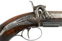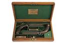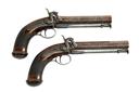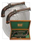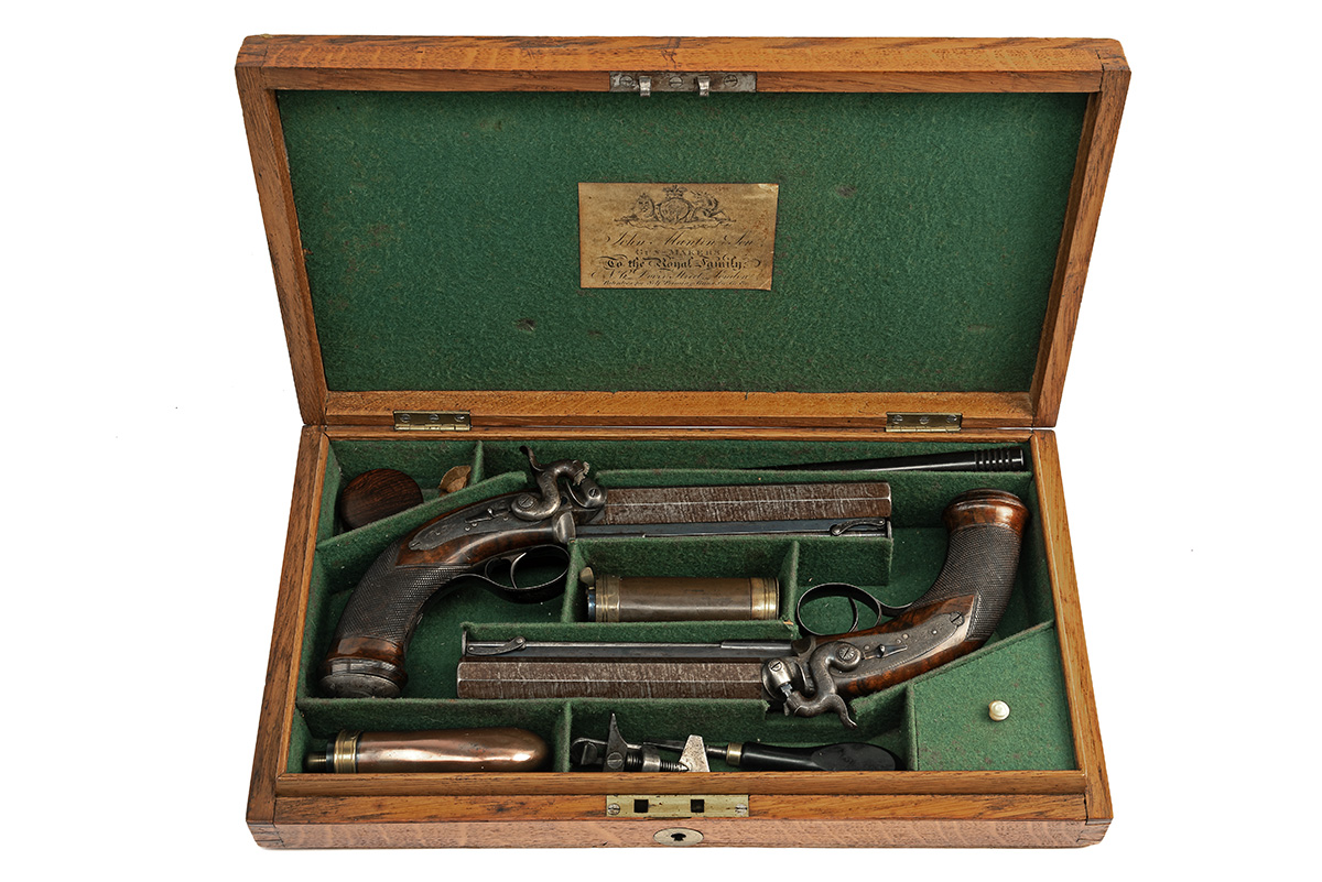circa 1840, with brown laminated octagonal 6in. barrels signed on the top-flats 'LONDON', border and scroll engraved colour hardened breech-blocks, bead fore-sights, fully engraved top-tangs with standing notch rear-sights, moulded nipple bosses with screwed plugs, border and scroll engraved diminutive curved back-action colour hardened locks signed 'MANTON & SON' and fitted with engraved dolphin-headed hammers with rear-mounted bolted safes, chequered walnut grips swelling at the pommel and fitted with engraved domed butt-caps with central traps, guarded triggers, London proofs and captive iron swivel ramrods below the barrel, the left side of each pistol with a sideplate mimicking the lockplate and fitted with a blued spring-steel belt-hook, strong amount of original finish to both pistols and complete with their oak storage case lined and compartmented in green baize and including a three-way flask, a further bag-shaped flask, a turn-screw, loading rod, spring cramp and a possibly later nipple or cap-pot, the inside of lid with John Manton & Son parchment trade-label