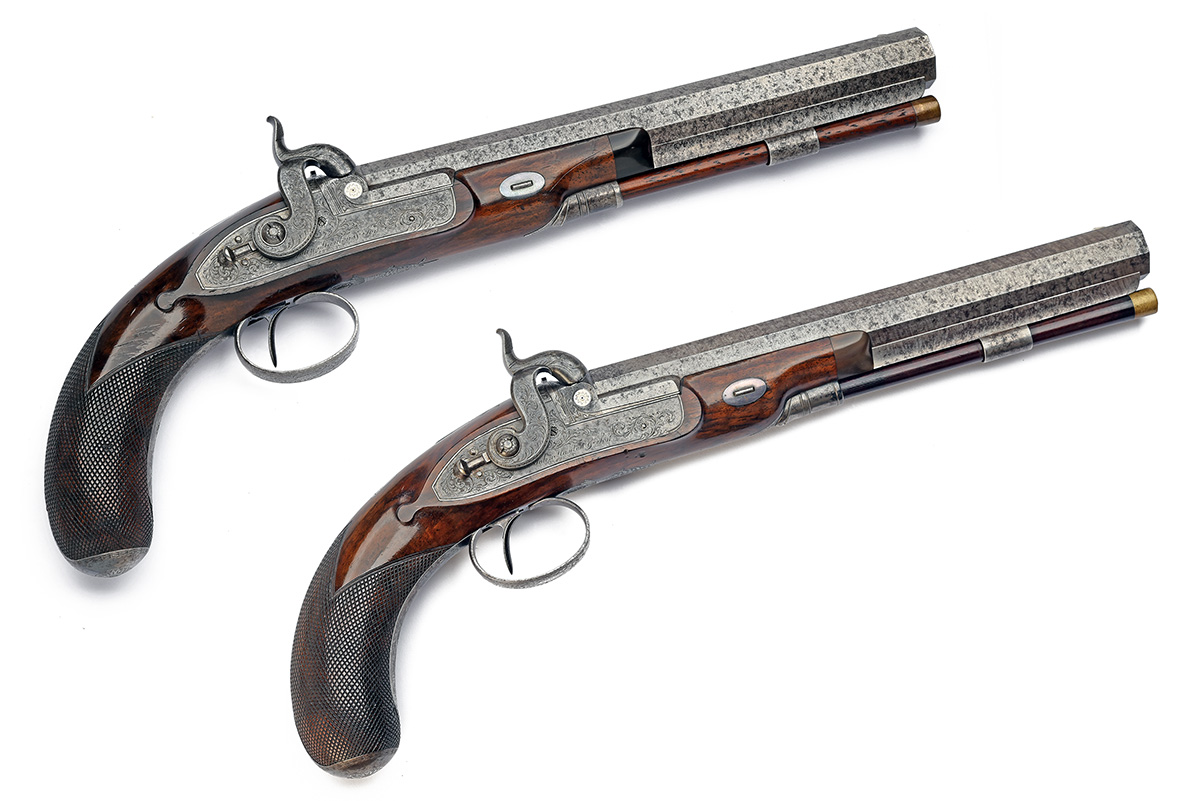 for between 1840-44, with octagonal 10in. scratch-rifled barrels signed in script 'JOHN MANTON & SON DOVER STREET LONDON', scroll engraved colour hardened breech-blocks with hexagonal based nipples, applied fore-sights, shallow standing notch rear-sights to the front of the engraved top-tangs, borderline and scroll engraved colour hardened locks with extensions above moulding to the sides of the standing breech and signed 'JOHN MANTON & SON PATENT', slab-sided hammers with dolphin engraved noses mirroring the nipple-wells and en-suite engraving, bolted safes, walnut half-stocks with chequered bag-shaped grips, blued and engraved iron furniture including domed butt-caps, single set triggers, white metal escutcheons to wrists engraved with a hippocampus below a crown, escutcheoned barrel keys, horn fore-end tips and mahogany ramrods, traces of finish remaining and in their maker's mahogany case lined and compartmented in green baize, good No.6 Dover Street trade label inside lid and complete with a three-way flask, matching number scissors ball mould, loading rod, turn-screw, cap-tin and a wad-punch, the same armorial as the pistols appearing on the lid escutcheon of case