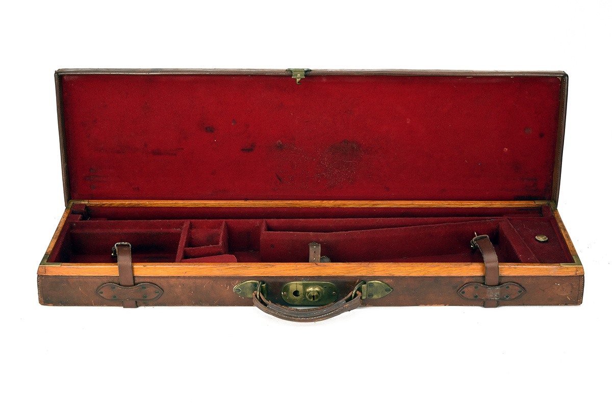AN OAK AND LEATHER SINGLE HAMMERGUN CASE,