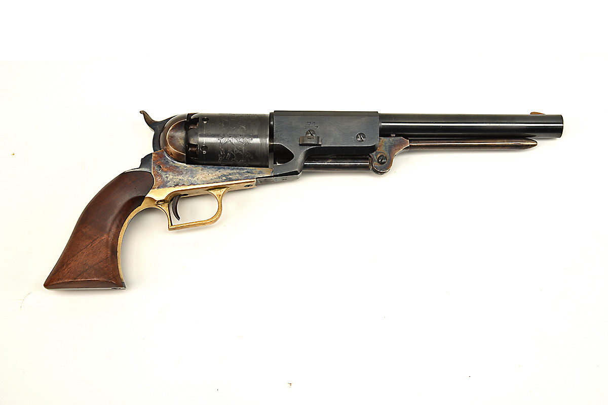 A BOXED REPRODUCTION .44 PERCUSSION ARMI SAN MARCO WALKER COLT REVOLVER, serial no. A85011, with blued two-stage 9in. barrel, colour hardened open iron frame, roll engraved blued cylinder and smooth walnut grip, appearing unfired in its maker's card and foam carton (distressed)