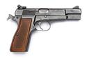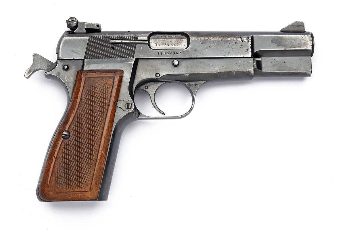 ** A 9mm (PARA) FN BROWNING HI-POWER SEMI-AUTOMATIC PISTOL, serial no. 77C57867, with 4 5/8in. barrel, blued slide and frame, adjustable sights, chequered walnut grips, missing magazine, finish worn