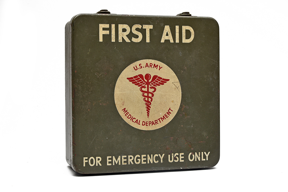 A UNITED STATES ARMY WORLD WAR II VEHICLE FIRST AID TIN, first issued 1944, steel, painted green with white and red stencilling, a few rust marks, no content