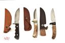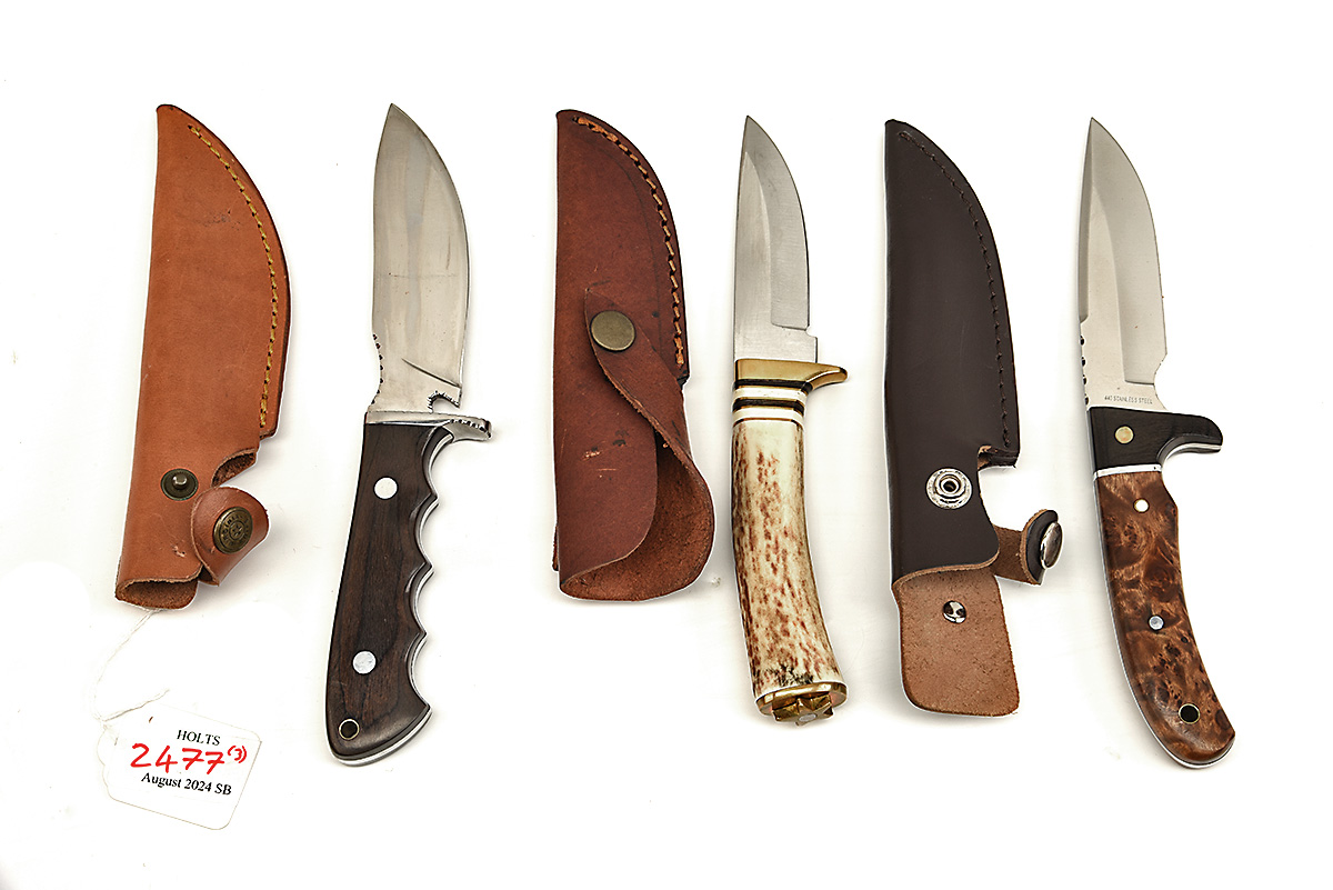 THREE ASSORTED OUTDOOR KNIVES IN LEATHER SHEATHS, approx 4.5in 'MADE IN SHEFFIELD ENGLAND' etched blade, full tang, stainless steel guard with wooden scale handle in tan leather sheath,