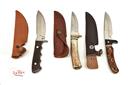 approx 4in 440 stainless steel blade, full tang, two tone wooden scale handle in dark brown leather sheath,