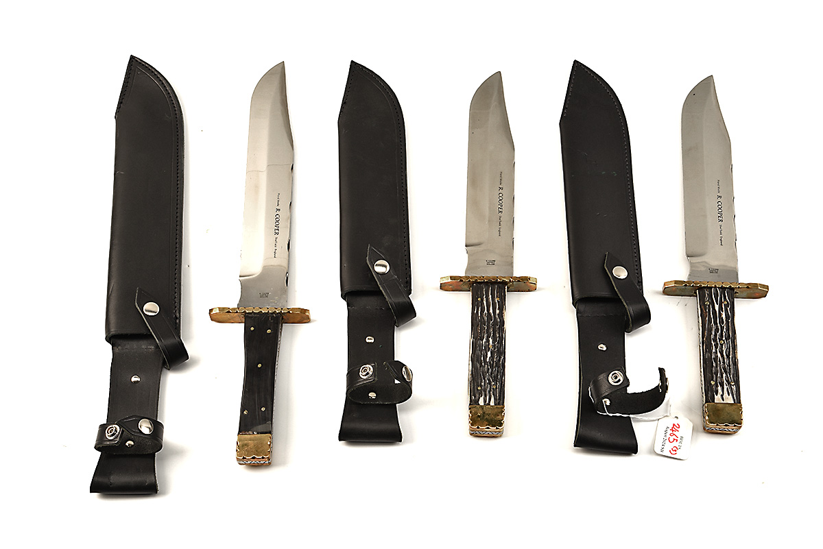 THREE LARGE HANDMADE 'R. COOPER' BOWIE KNIVES WITH SHEATHS, approx 10in 'HANDMADE R. COOPER SHEFFIELD ENGLAND' etched blade, full tang, brass cross guard and pommel, 2 with stag antler scales & 1 with buffalo horn in black leather sheaths 3