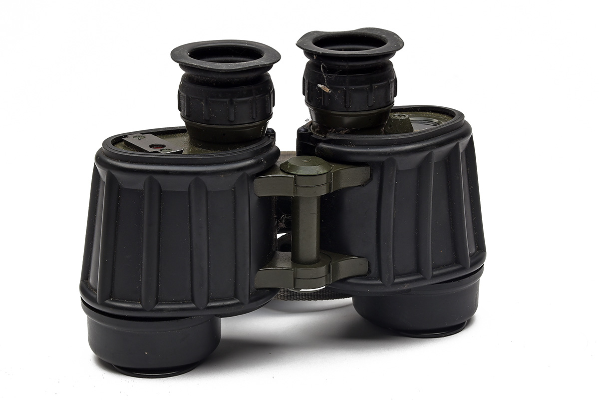 A RARE EAST GERMAN STASI 7x40 CARL ZEISS JENA BINOCULAR, circa 1950s, rubber armoured body and soft rubber folding eye-cups, independent eye-piece focussing, front plate marked 'MdI' for Ministerium des Innern [i.e. Ministry of the Interior for STASI use], has a detector for active infra-red sources charged by the UV contribution of the daylight, complete with rain-guard, carry strap and lens caps