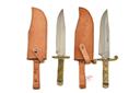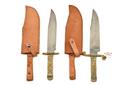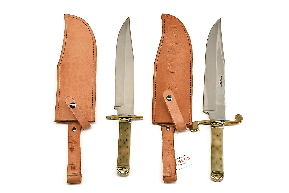 TWO LARGE BOWIE KNIVES IN TAN LEATHER SHEATHS, approx 10in blades, full tang, brass half guard & pommel, horn scale handle in tan leather sheaths 2