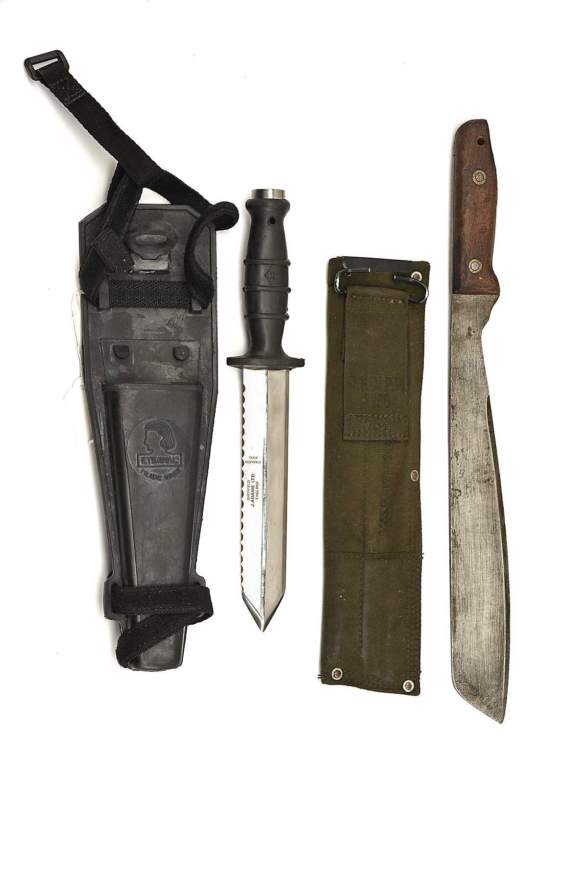A 'J. ADAMS' DIVER'S KNIFE & 'MARTINDALE' MILITARY MACHETE IN SHEATHS, 'J. ADAMS' No. 4220 approx 7in stainless steel dagger with a serrated back blade, full tang, rubber handle in rubber 'ETERNAL' sheath,