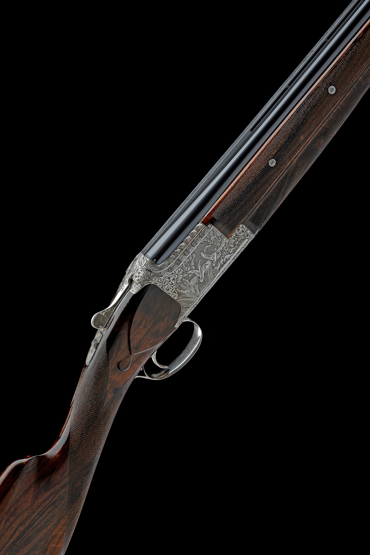 for 1973, 27 1/2in. (70cm) nitro barrels with 6mm ventilated matt top-rib, 2 3/4in. chamber, bored approx. 1/4 and 3/4 choke, hold-open toplever, manual safety with integral barrel-selector switch and gold-inlaid 'O', 'U' and 'S' details, chequered single-trigger, bold acanthus scroll engraving surrounding scenes of pheasant and duck, signed 'L. ACAMPO', the action bar signed 'D4G' and 'A. CUISSET.', old silver finish, 14 1/4in. highly-figured roachbelly stock, weight 6lb. 15oz., together with a Flambeau hardcase