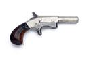 AN UNSIGNED .30 RIMFIRE DERRINGER PISTOL, serial no. 35, circa 1875, with nickel-plated two-stage 2 3/4in. barrel swinging sideways to load, open plated frame, central hammer and spur trigger and smooth walnut birdshead grips
