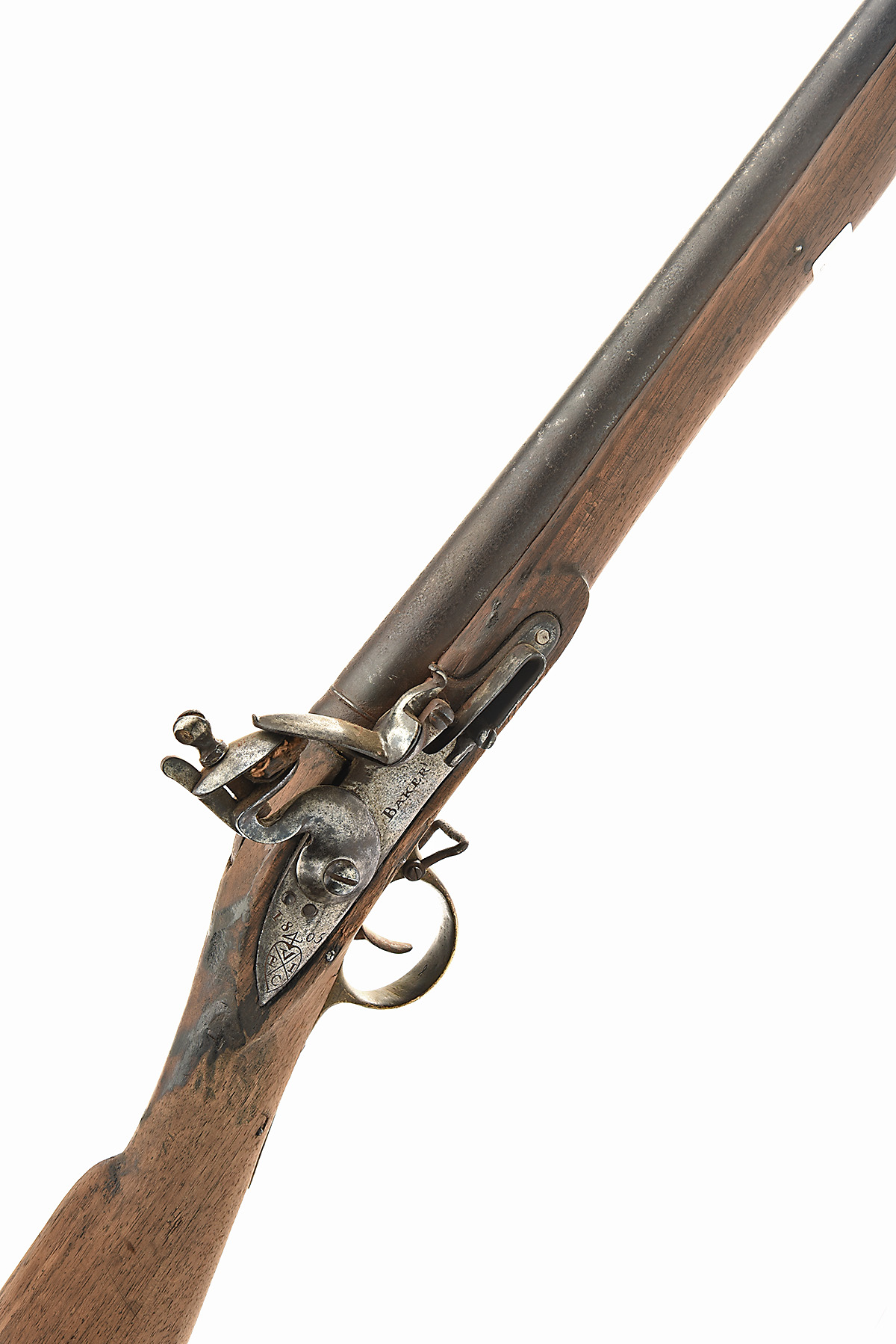 A .750 FLINTLOCK EAST INDIA COMPANY BROWN-BESS MUSKET SIGNED BAKER, no visible serial number, dated for 1805, with round iron 39in. barrel (currently partially obstructed), signed lock dated at the tail together with the E.I.C. heart trademark, walnut full-stock (cleaned of finish, small losses), brass furniture and iron ramrod (frozen)