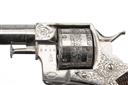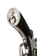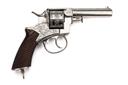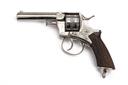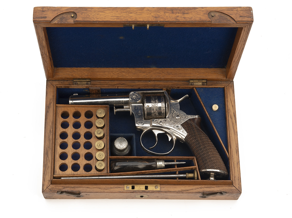 circa 1868, with nickel-plated (possibly silver) reverse tapering 4 1/2in. barrel, applied fore-sight blade, narrow sighting groove to the border engraved top-strap signed either side 'T. BISSELL' and 'LONDON', plain six-shot cylinder with a trio of scroll engraved bands, front locking notches, borderline and scroll engraved solid stepped frame marked with the Webley & Scott 'winged bullet' trademark and 'WEBLEYS PATENT' in an oval below, large trigger-guard and long hammer spur, chequered walnut semi saw-handled grip, shallow domed iron heel-plate with central lanyard ring, virtually all plated finish remaining and in its blue baize lined oak case, the interior with cartridge tray and compartments for an oil-bottle, turn-screw and cleaning rod (all included), retaining the original case key and six dummy cartridges