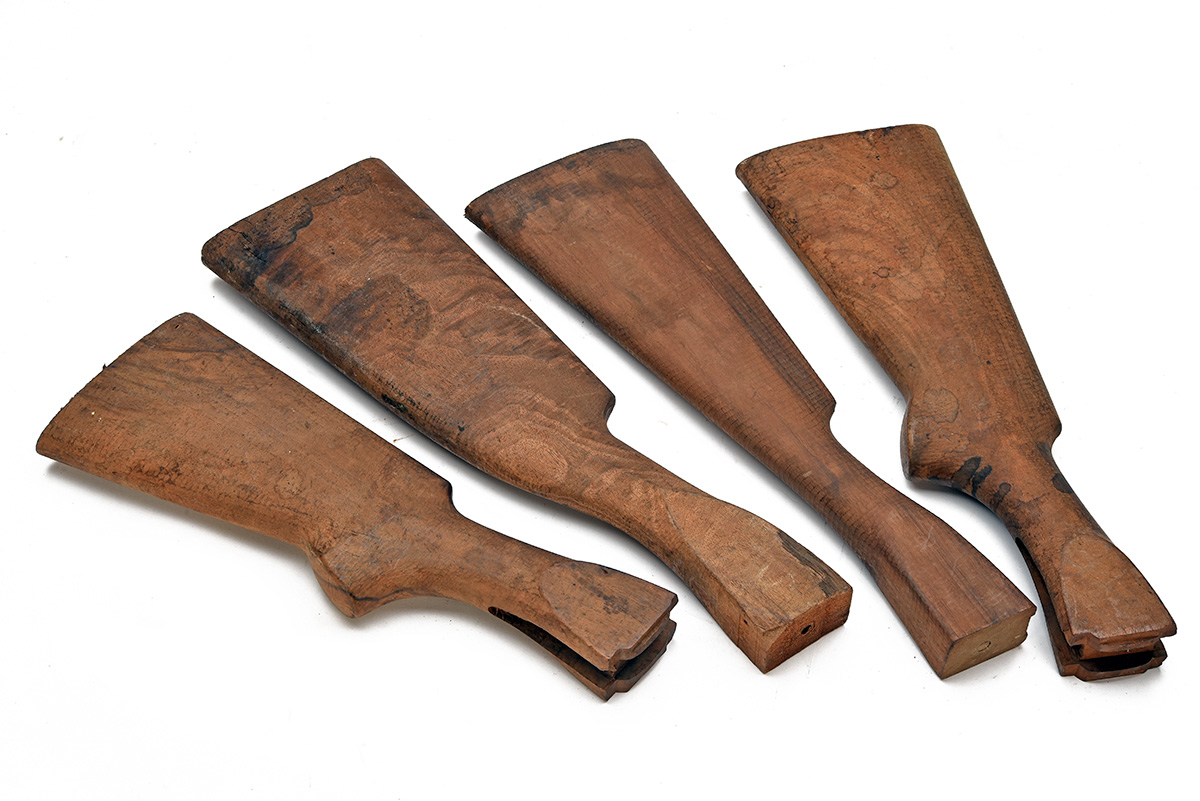 FOUR ROUGH FINISH WOODEN SHOTGUN STOCKS, approx measurements
