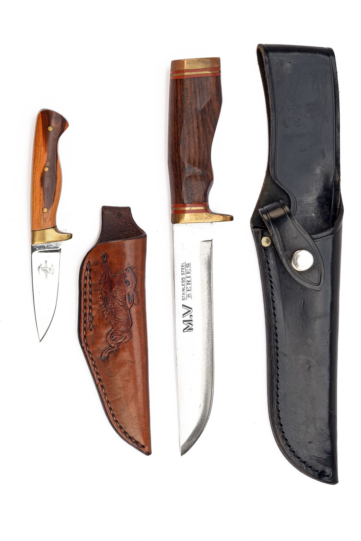 TWO HUNTING KNIVES IN SHEATHS, 'M.V' stainless steel series, approx 6in straight back blade, stick tang, brass half guard & pommel, wood handle in black leather sheath,