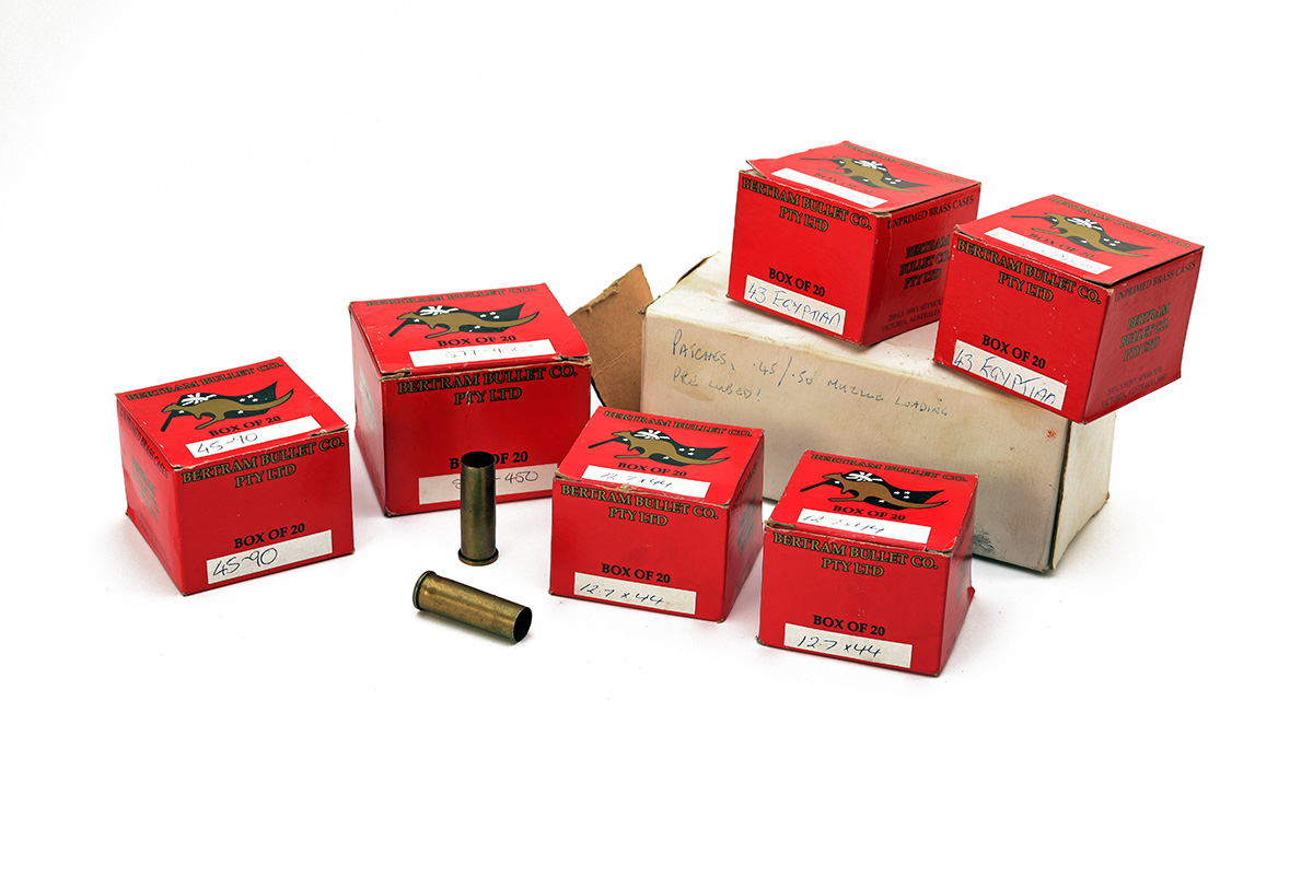 A QUANTITY OF UNUSED ASSORTED UNPRIMED BRASS CASES AND 'WONDER PATCHES' IN BOX, comprises of approx. 20 x 45/90, 29 x 12.7 X44R, 34 x .43 EGYPTIAN, 20 x 577/450, 6 x 'WONDER PATCHES' 100 pack pre-lubricated cotton patches No. 7043 ,45 & .50 calibre