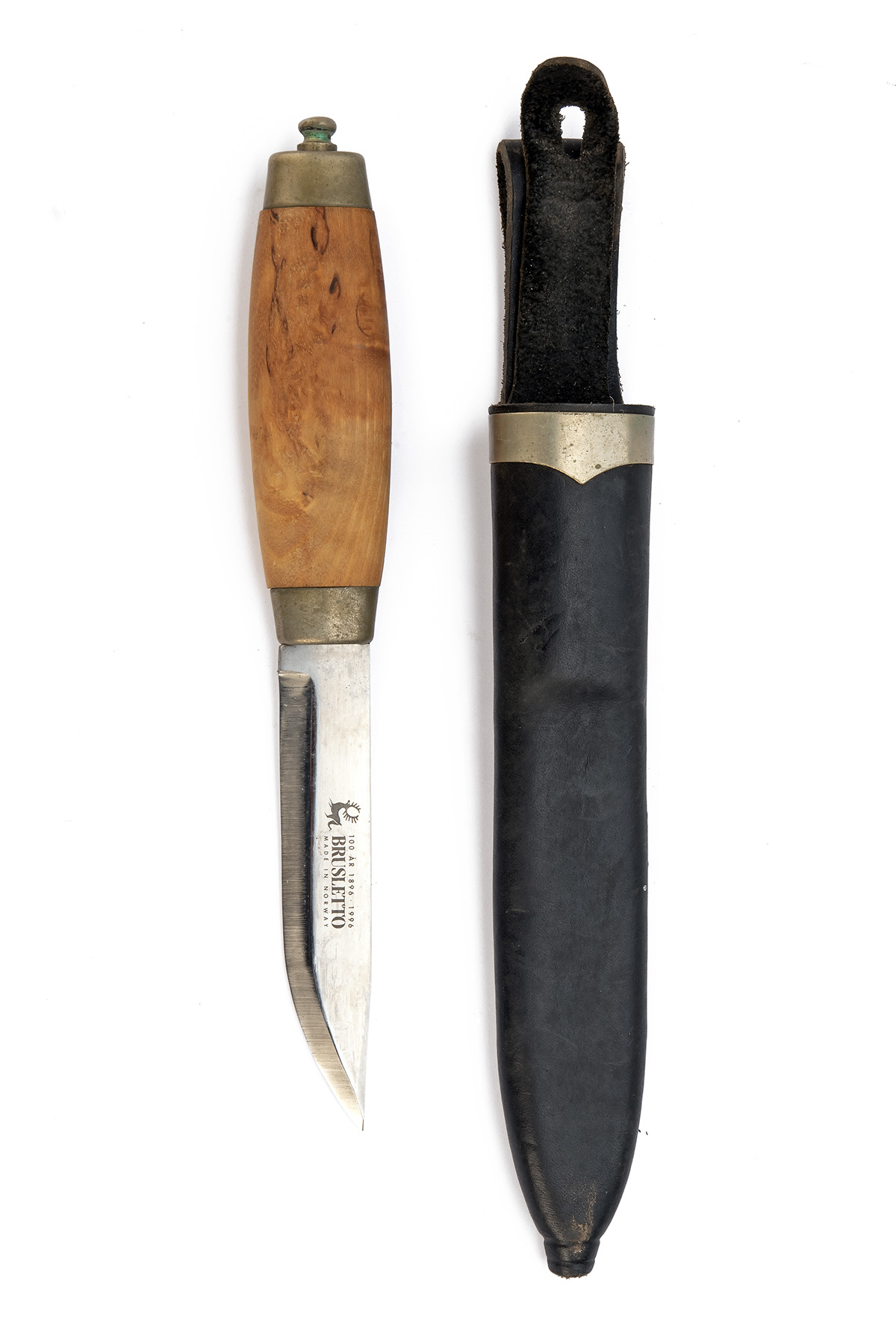 'BRUSLETTO GRANBIT' OUTDOOR KNIFE IN COWHIDE SHEATH. approx. 4in. straight cut 141116N stainless steel blade, nickel silver bolster & pommel, Oljet Masurbjørk handle with locking strap cowhide sheath in black