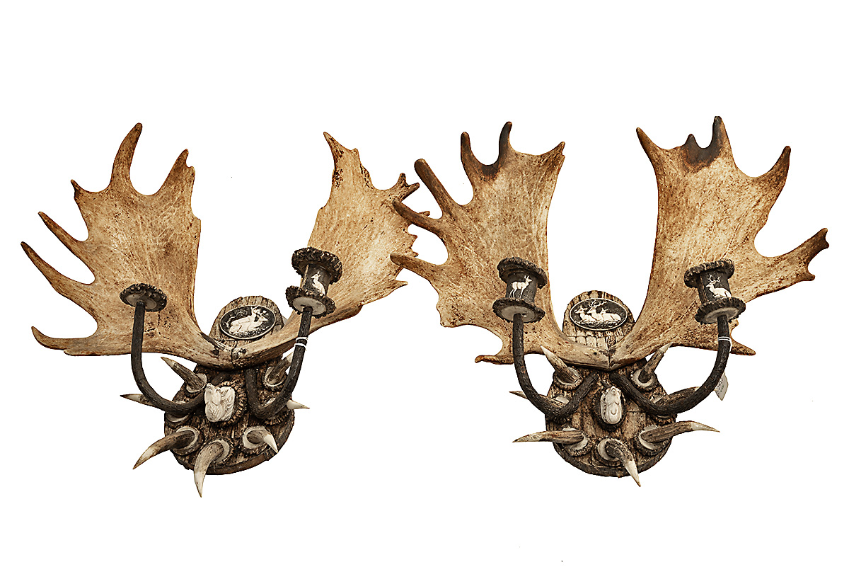 TWO RUSTIC MOOSE ANTLER CANDLE HOLDERS MOUNTED ON WOODEN PLAQUES, 1 x candle holder damaged, wood signs of wear, ornate deer carvings, emblem depicting deer & stags (2)
