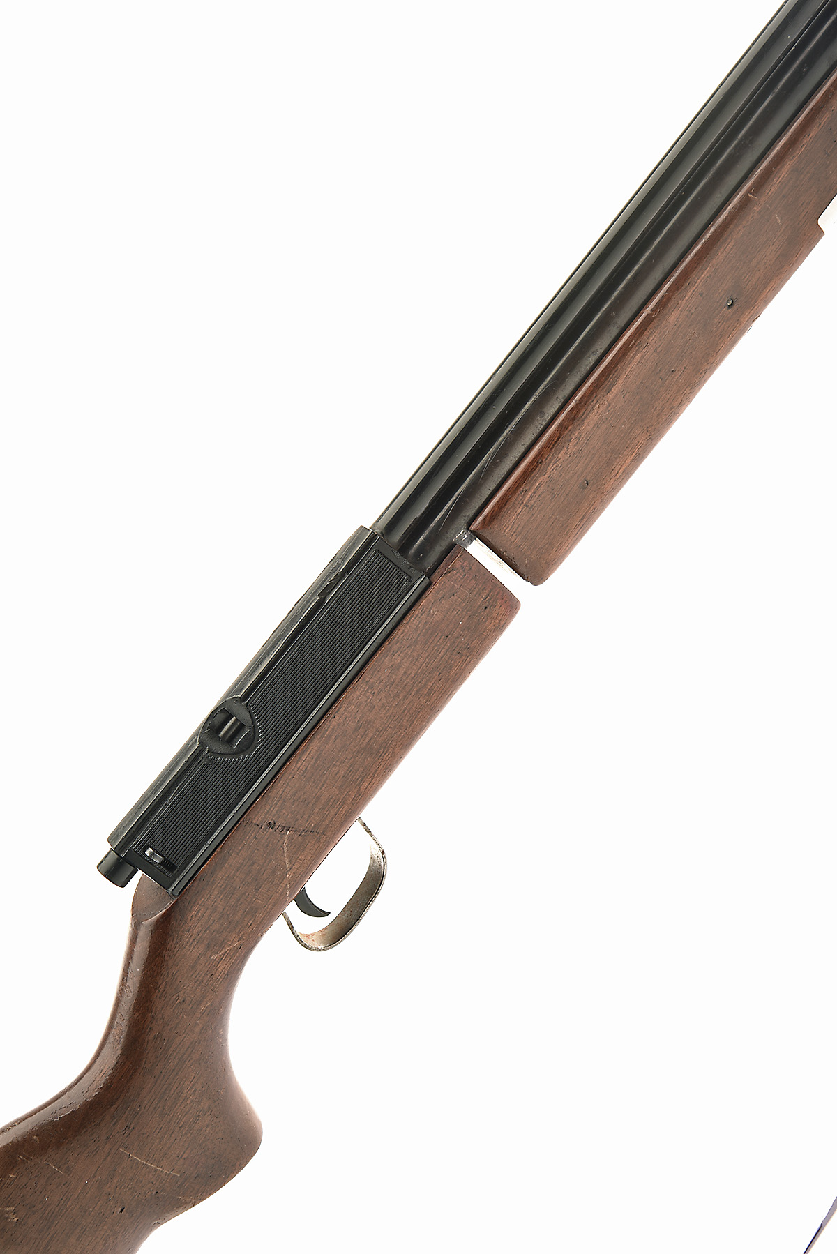AN EARLY .22 SHARP INNOVA MULTI-PUMP PNEUMATIC AIR-RIFLE, no visible serial number, with 25in. barrel including dedicated sound-moderator, plastic receiver with sprung bolt, Japanese walnut butt-stock and fore-end, requires seals