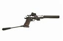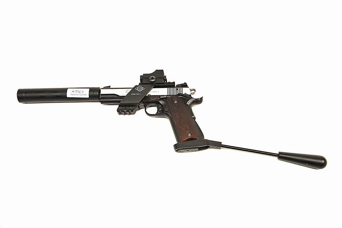A CASED .22 (L/R) GSG 1911 LONG-BARRELLED PISTOL, serial no. A740891, with 11 7/8in. barrel, built-on dummy sound moderator, blacked frame, the slide with brushed bright sides, chequered woodgrain effect grips and permanent wrist-brace to rear, fitted with a Sight Mark reflex sight, in its maker's abs plastic carry-case with two new spare magazines together with some tools and spares