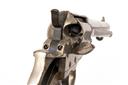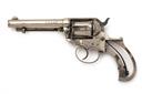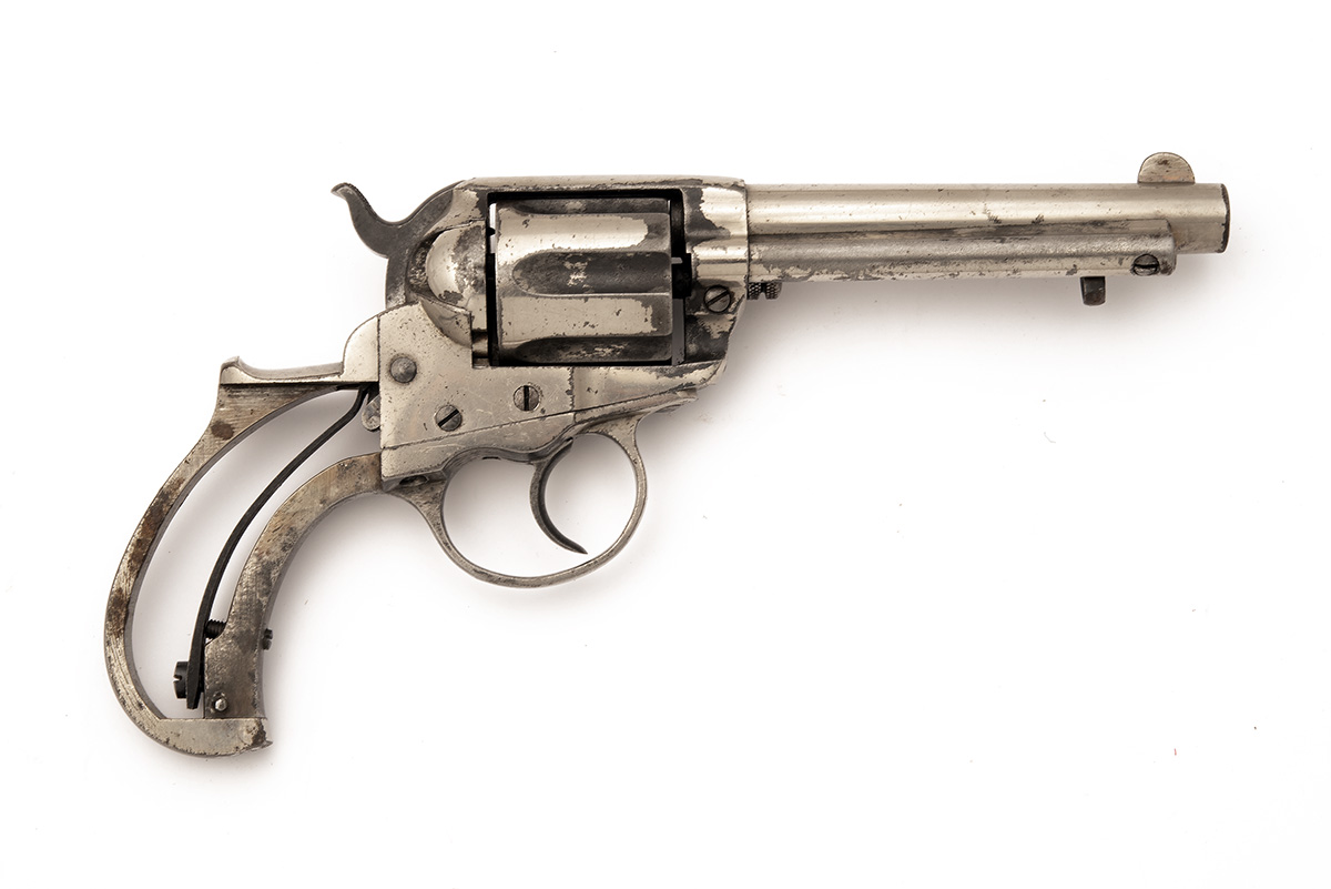 for 1891, with nickel-plated round 4 1/2in. barrel signed on the top in two lines, calibre designation to the left hand side, six-shot fluted cylinder, solid frame with three lines of patents and the 'Colt' trademark stamped within a circle on the left, spurred hammer, guarded trigger, missing grips, the back-strap with thumb-spur, fitted with an under-barrel ejector, retaining a fair amount of original plated finish, with certificate of proof
