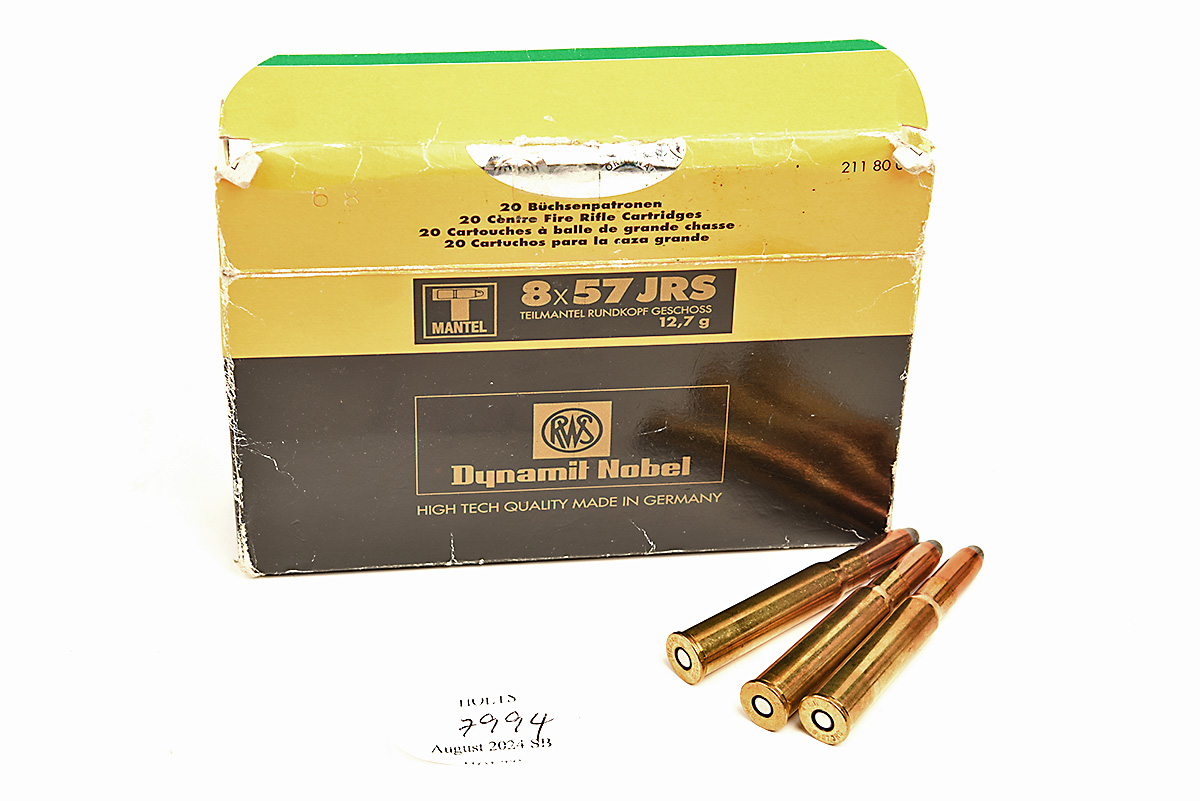 20 ROUNDS OF DYNAMIT NOBEL 8X57JRS 12,7g AMMUNITION, Please be advised that cartridges/ammunition, primers, primed cases, blanks and percussion caps CANNOT BE SENT ANYWHERE in the UK or EXPORTED OVERSEAS by POST or CARRIER. Due to this NATIONAL and INTERNATIONAL CARRIER rule, within 30 days of the sale date, please arrange collection with our shipping department from our Norfolk HQ. If payment and collection is not arranged within 30 days of the sale date, that will indicate that the items are not required and they will be disposed of.
