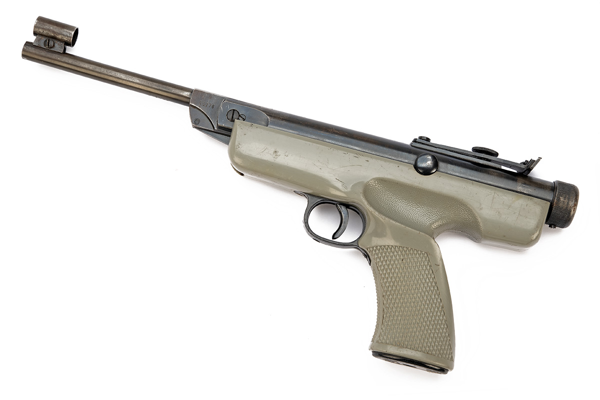 A .177 DIANA (ORIGINAL) MOD 6 RECOILLESS BREAK-BARREL AIR PISTOL serial no. 03778, in a later box, early production circa 1970, with 7in. sighted barrel, recoilless mechanism, light grey over-moulded grip, finish worn, in a later card box