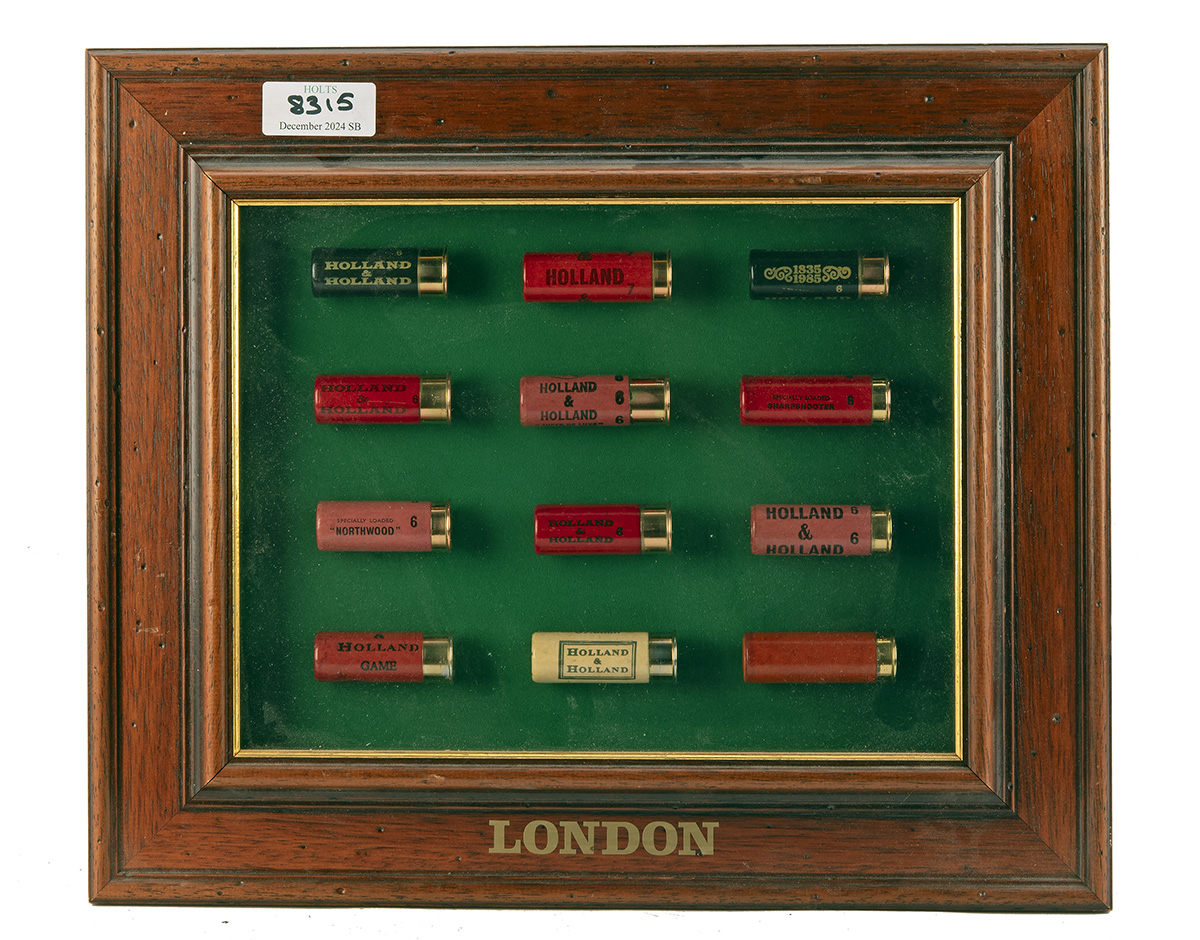 A MODERN CARTRIDGE DISPLAY BOARD WITH A SELECTION OF HOLLAND & HOLLAND 12-BORE CARTRIDGES 41CM X 34 CM