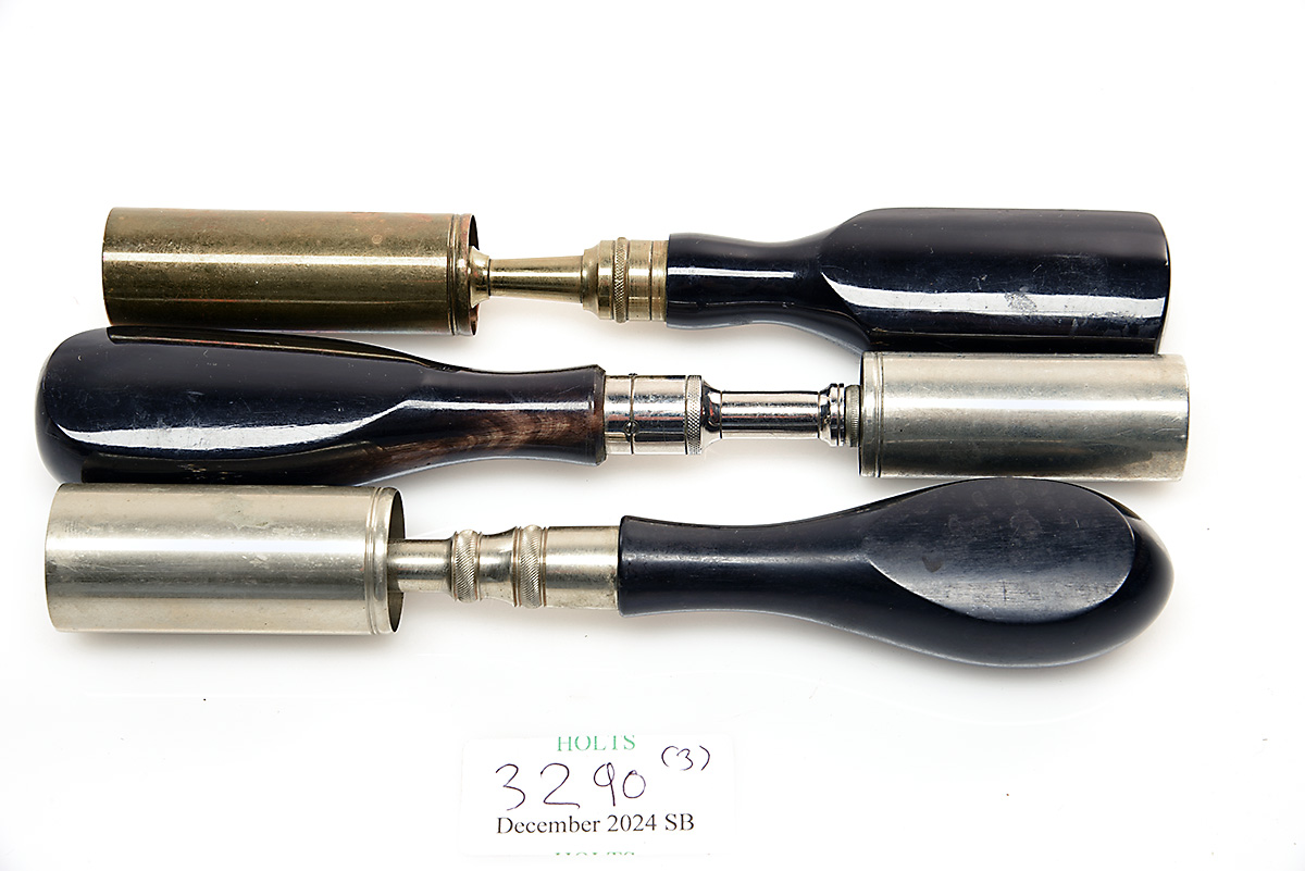 A 'COGSWELL & HARRISON' HORN-HANDLED CHAMBER BRUSH WITH TWO UNBRANDED CHAMBER BRUSHES, 'COGSWELL & HARRISON' horn handle & brass 12-bore brush, one horn handle nickel-plated brush, one ebony handle nickel-plated brush (3)