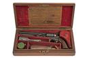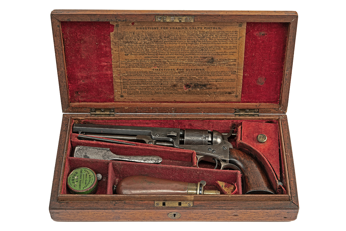 for 1854, with octagonal 6in. barrel signed on the top-flat 'ADDRESS COL. COLT LONDON' within brackets on two lines, London proofs, open iron frame with slight traces of colour, plain cylinder with roll engraved scene, dome-headed London screws, silver-plated iron grip-straps, walnut flared one-piece grip and under-barrel rammer with traces of colour, all matching numbers (blued finish darkly stained); together with a period American casing lined and compartmented in red velvet (some compartments loose) and including an original James Dixon flask, cleaning rod, signed Colt iron mould marked '.31PKT.', 'L' shaped nipple-key (probably from an 'army' model), cap-tin and iron cleaning rod, all probably period to this revolver, original parchment instruction label inside lid